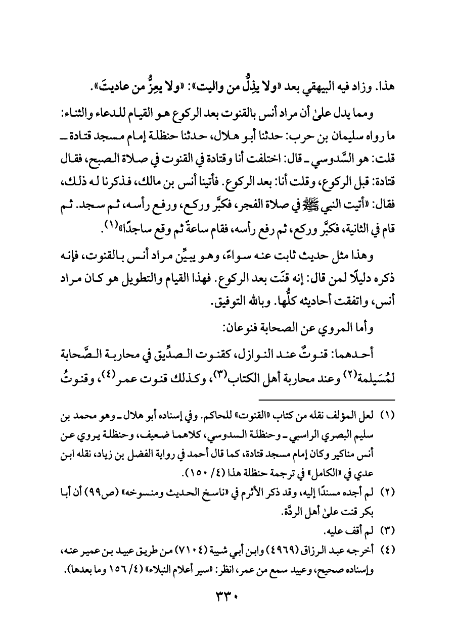 ومما يدل على أن مراد أنس بالقنوت بعد الركوع هو القيام للدعاء والثناء: ما رواه سليمان بن حرب: حدثنا أبو هلال، حدثنا حنظلة إمام مسجد قتادة ــ قلت: هو السَّدوسي ــ قال: اختلفت أنا وقتادة في القنوت في صلاة الصبح، فقال قتادة: قبل الركوع، وقلت أنا: بعد الركوع. فأتينا أنس بن مالك، فذكرنا له ذلك، فقال: «أتيت النبي - صلى الله عليه وسلم - في صلاة الفجر، فكبَّر وركع، ورفع رأسه، ثم سجد. ثم قام في الثانية، فكبَّر وركع، ثم رفع رأسه، فقام ساعةً ثم وقع ساجدًا» (¬١).
