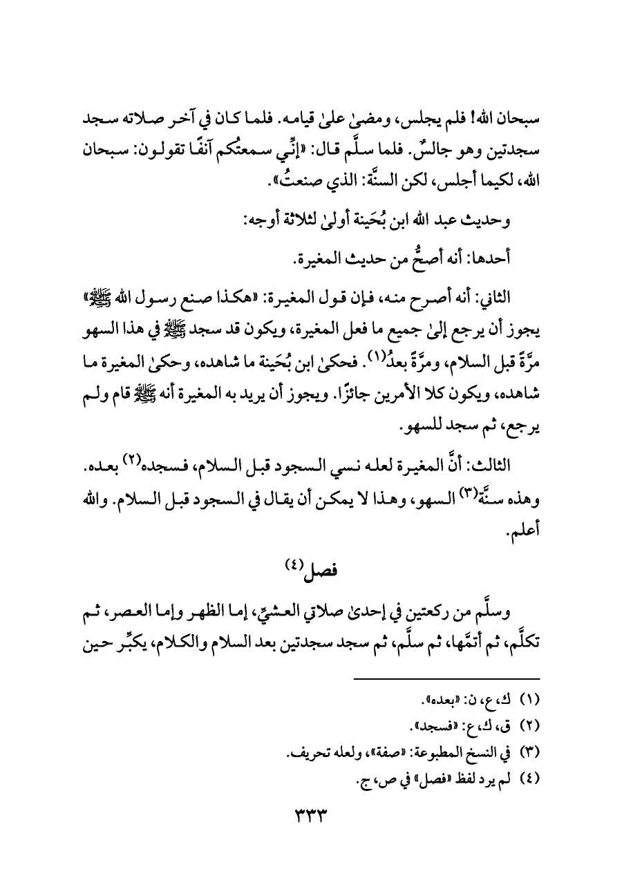 الثاني: أنه أصرح منه، فإن قول المغيرة: «هكذا صنع رسول الله - صلى الله عليه وسلم -» يجوز أن يرجع إلى جميع ما فعل المغيرة، ويكون قد سجد - صلى الله عليه وسلم - في هذا السهو مرَّةً قبل السلام، ومرَّةً بعدُ (¬١). فحكى ابن بُحَينة ما شاهده، وحكى المغيرة ما شاهده، ويكون كلا الأمرين جائزًا. ويجوز أن يريد به المغيرة أنه - صلى الله عليه وسلم - قام ولم يرجع، ثم سجد للسهو.
