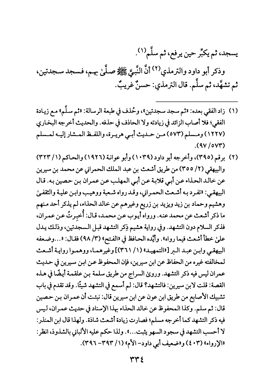 (¬٢) برقم (٣٩٥)، وأخرجه أبو داود (١٠٣٩) وأبو عوانة (١٩٢٦) والحاكم (١/ ٣٢٣) والبيهقي (٢/ ٣٥٥) من طريق أشعث بن عبد الملك الحمراني عن محمد بن سيرين عن خالد الحذاء عن أبي قلابة عن أبي المهلب عن عمران بن حصين به. قال البيهقي: «تفرد به أشعث الحمراني، وقد رواه شعبة ووهيب وابن علية والثقفى وهشيم وحماد بن زيد ويزيد بن زريع وغيرهم عن خالد الحذاء، لم يذكر أحد منهم ما ذكر أشعث عن محمد عنه. ورواه أيوب عن محمد، قال: أُخبِرتُ عن عمران، فذكر السلام دون التشهد. وفي رواية هشيم ذِكر التشهد قبل السجدتين، وذلك يدل على خطأ أشعث فيما رواه». وأيَّده الحافظ في «الفتح» (٣/ ٩٨) فقال: « ... وضعفه البيهقي وابن عبد البر [«التمهيد» (١/ ٣٦١)] وغيرهما، ووهموا رواية أشعث لمخالفته غيره من الحفاظ عن ابن سيرين، فإن المحفوظ عن ابن سيرين في حديث عمران ليس فيه ذكر التشهد. وروى السراج من طريق سلمة بن علقمة أيضًا في هذه القصة: قلت لابن سيرين: فالتشهد؟ قال: لم أسمع في التشهد شيئًا. وقد تقدم في باب تشبيك الأصابع من طريق ابن عون عن ابن سيرين قال: نبئت أن عمران بن حصين قال: ثم سلم. وكذا المحفوظ عن خالد الحذاء بهذا الإسناد في حديث عمران، ليس فيه ذكر التشهد كما أخرجه مسلم؛ فصارت زيادة أشعث شاذة. ولهذا قال ابن المنذر: لا أحسب التشهد في سجود السهو يثبت ... ». ولذا حكم عليه الألباني بالشذوذ، انظر: «الإرواء» (٤٠٣) و «ضعيف أبي داود- الأم» (١/ ٣٩٣ - ٣٩٦).