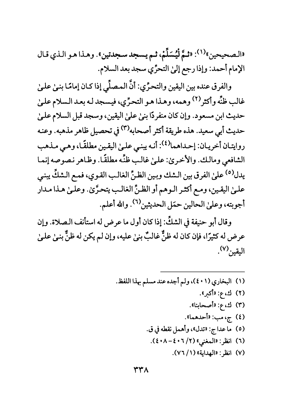 والفرق عنده بين اليقين والتحرِّي: أنَّ المصلِّي إذا كان إمامًا بنى على غالب ظنِّه وأكثر (¬٢) وهمه، وهذا هو التحرِّي، فيسجد له بعد السلام على حديث ابن مسعود. وإن كان منفردًا بنى على اليقين، وسجد قبل السلام على حديث أبي سعيد. هذه طريقة أكثر أصحابه (¬٣) في تحصيل ظاهر مذهبه. وعنه روايتان أخريان: إحداهما (¬٤): أنه يبني على اليقين مطلقًا، وهي مذهب الشافعي ومالك. والأخرى: على غالب ظنِّه مطلقًا. وظاهر نصوصه إنما يدل (¬٥) على الفرق بين الشك وبين الظنِّ الغالب القوي، فمع الشكِّ يبني على اليقين, ومع أكثر الوهم أو الظنِّ الغالب يتحرَّى. وعلى هذا مدار أجوبته، وعلى الحالين حمَل الحديثين (¬٦). والله أعلم.