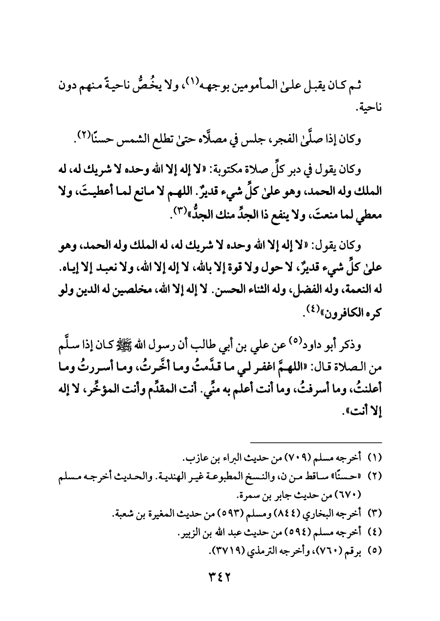 وكان يقول في دبر كلِّ صلاة مكتوبة: «لا إله إلا الله وحده لا شريك له، له الملك وله الحمد، وهو على كلِّ شيء قديرٌ. اللهم لا مانع لما أعطيتَ، ولا معطي لما منعتَ، ولا ينفع ذا الجدِّ منك الجدُّ» (¬٣).