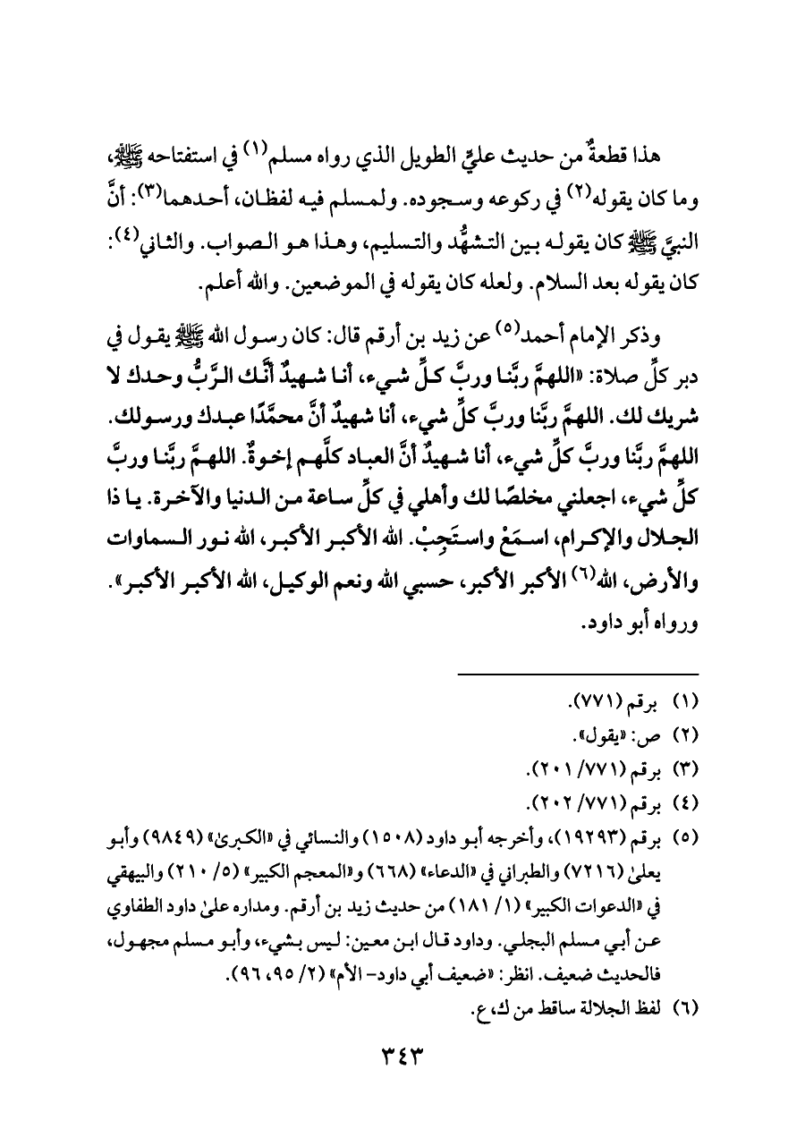 هذا قطعةٌ من حديث عليٍّ الطويل الذي رواه مسلم (¬١) في استفتاحه - صلى الله عليه وسلم -، وما كان يقوله (¬٢) في ركوعه وسجوده. ولمسلم فيه لفظان، أحدهما (¬٣): أنَّ النبيَّ - صلى الله عليه وسلم - كان يقوله بين التشهُّد والتسليم، وهذا هو الصواب. والثاني (¬٤): كان يقوله بعد السلام. ولعله كان يقوله في الموضعين. والله أعلم.