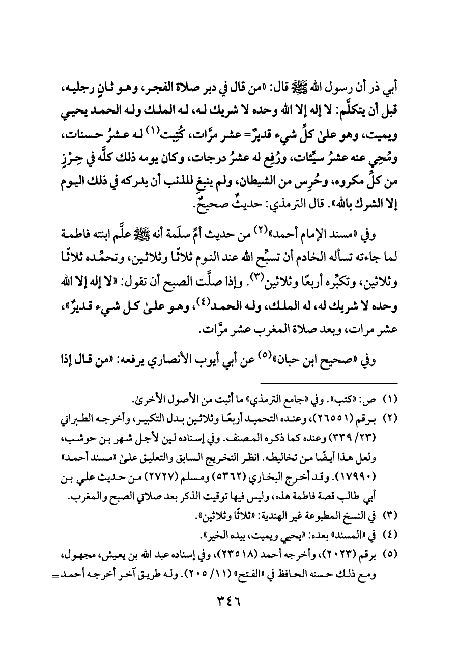 أبي ذر أن رسول الله - صلى الله عليه وسلم - قال: «من قال في دبر صلاة الفجر، وهو ثانٍ رجليه، قبل أن يتكلَّم: لا إله إلا الله وحده لا شريك له، له الملك وله الحمد يحيي ويميت, وهو على كلِّ شيء قديرٌ= عشر مرَّات، كُتِبت (¬١) له عشرُ حسنات، ومُحِي عنه عشرُ سيِّئات، ورُفِع له عشرُ درجات، وكان يومه ذلك كلَّه في حِرْزٍ من كلِّ مكروه، وحُرِس من الشيطان، ولم ينبغِ للذنب أن يدركه في ذلك اليوم إلا الشرك بالله». قال الترمذي: حديثٌ صحيحٌ.