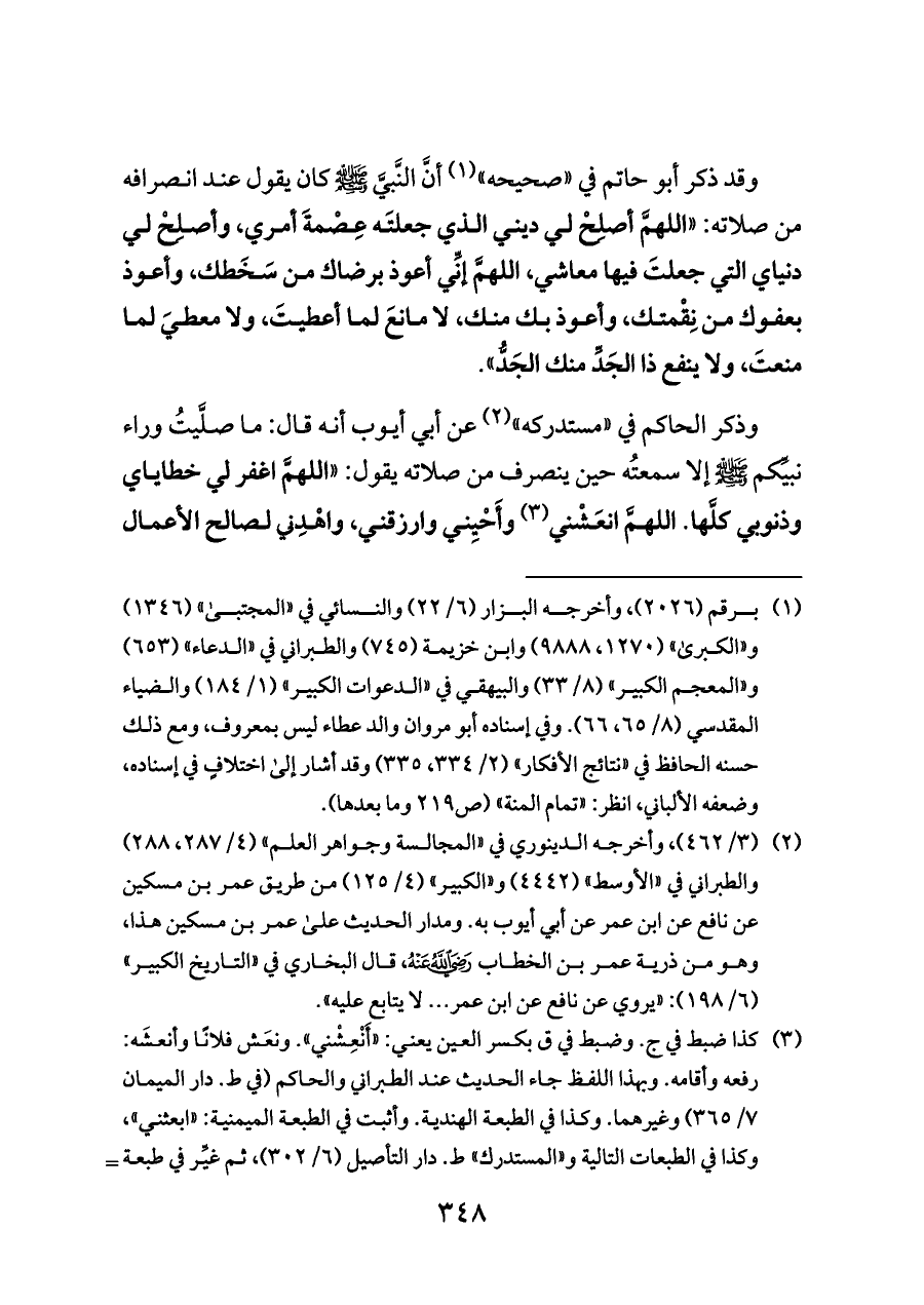 وذكر الحاكم في «مستدركه» (¬٢) عن أبي أيوب أنه قال: ما صلَّيتُ وراء نبيِّكم - صلى الله عليه وسلم - إلا سمعتُه حين ينصرف من صلاته يقول: «اللهمَّ اغفر لي خطاياي وذنوبي كلَّها. اللهمَّ انعَشْني (¬٣) وأَحْيِني وارزقني، واهْدِني لصالح الأعمال
