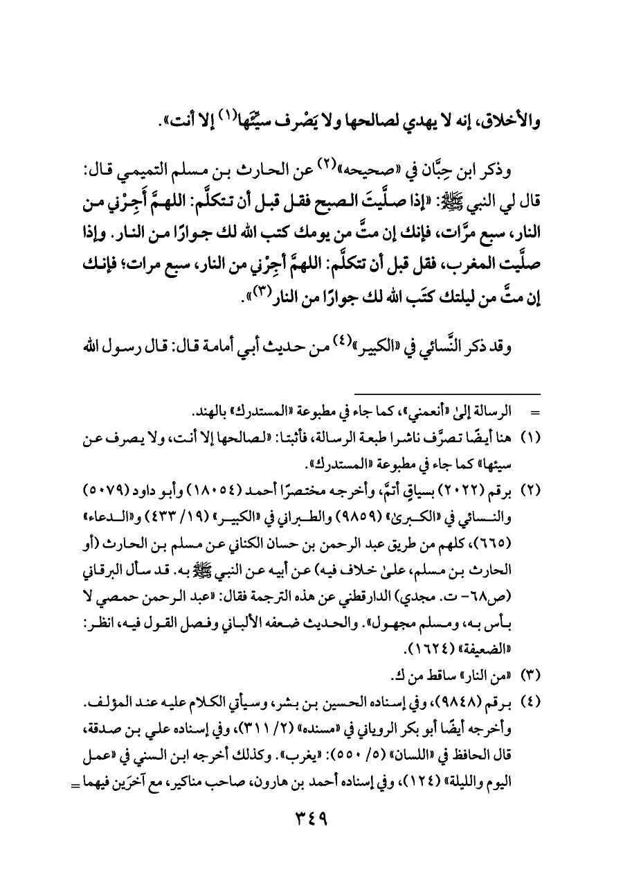وذكر ابن حِبَّان في «صحيحه» (¬٢) عن الحارث بن مسلم التميمي قال: قال لي النبي - صلى الله عليه وسلم -: «إذا صلَّيتَ الصبح فقل قبل أن تتكلَّم: اللهمَّ أَجِرْني من النار، سبع مرَّات، فإنك إن متَّ من يومك كتب الله لك جوارًا من النار. وإذا صلَّيت المغرب، فقل قبل أن تتكلَّم: اللهمَّ أجِرْني من النار، سبع مرات؛ فإنك إن متَّ من ليلتك كتَب الله لك جوارًا من النار (¬٣)».