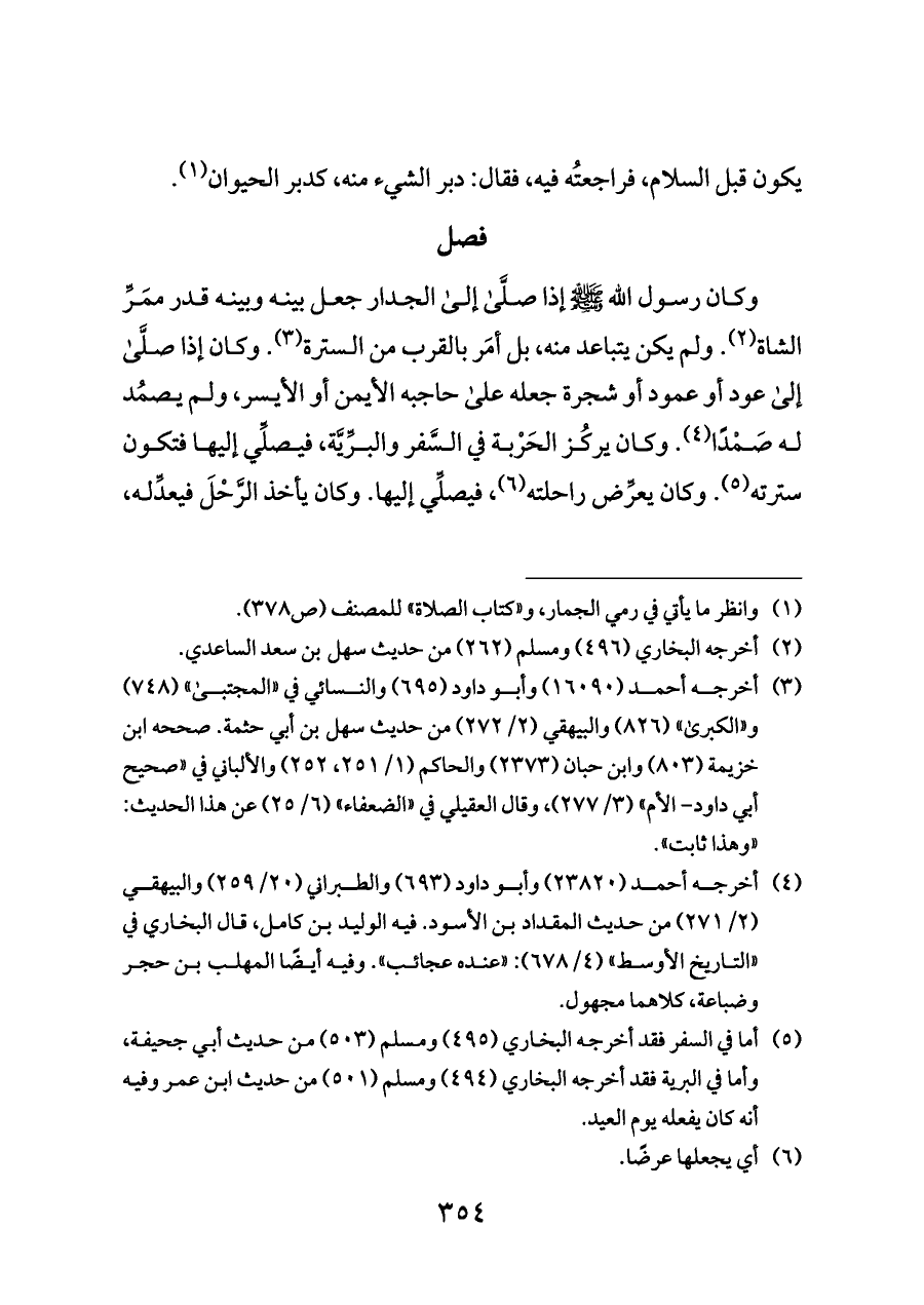 وكان رسول الله - صلى الله عليه وسلم - إذا صلَّى إلى الجدار جعل بينه وبينه قدر ممَرِّ الشاة (¬٢). ولم يكن يتباعد منه، بل أمَر بالقرب من السترة (¬٣). وكان إذا صلَّى إلى عود أو عمود أو شجرة جعله على حاجبه الأيمن أو الأيسر، ولم يصمُد له صَمْدًا (¬٤). وكان يركُز الحَرْبة في السَّفر والبرِّيَّة، فيصلِّي إليها فتكون سترته (¬٥). وكان يعرِّض راحلته (¬٦)، فيصلِّي إليها. وكان يأخذ الرَّحْلَ فيعدِّله،