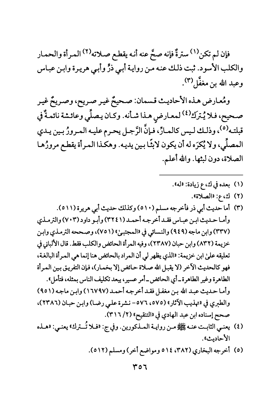 وأما حديث ابن عباس فقد أخرجه أحمد (٣٢٤١) وأبو داود (٧٠٣) والترمذي (٣٣٧) وابن ماجه (٩٤٩) والنسائي في «المجتبى» (٧٥١)، وصححه الترمذي وابن خزيمة (٨٣٢) وابن حبان (٢٣٨٧)، وفيه المرأة الحائض والكلب فقط. قال الألباني في تعليقه على ابن خزيمة: «الذي يظهر لي أن المراد بالحائض هنا إنما هي المرأة البالغة، فهو كالحديث الآخر (لا يقبل الله صلاة حائض إلا بخمار)، فإن التفريق بين المرأة الطاهرة وغير الطاهرة ــ أي الحائض ــ أمر عسير، يبعد تكليف الناس بمثله، فتأمل».