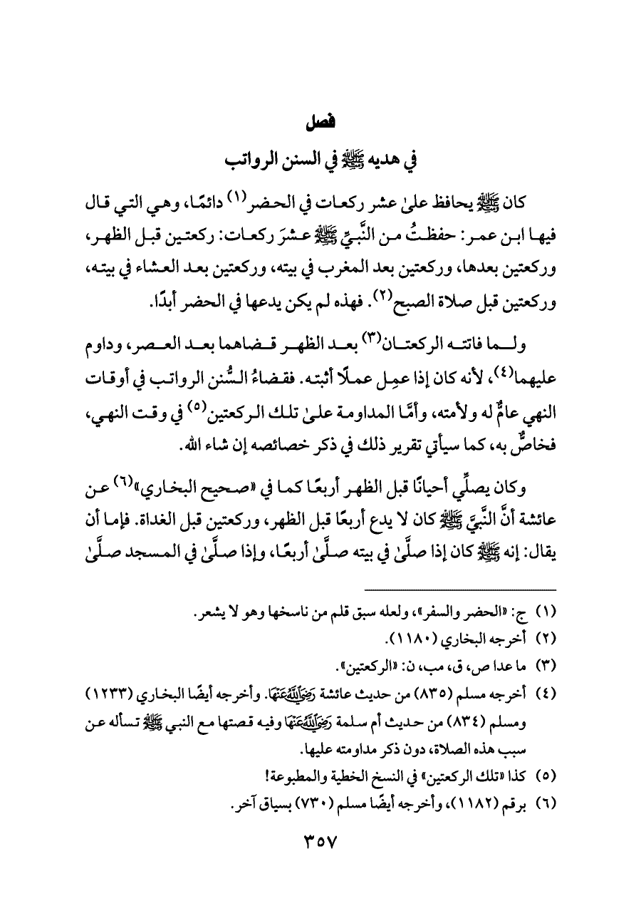 ولما فاتته الركعتان (¬٣) بعد الظهر قضاهما بعد العصر، وداوم عليهما (¬٤)، لأنه كان إذا عمِل عملًا أثبته. فقضاءُ السُّنن الرواتب في أوقات النهي عامٌّ له ولأمته، وأمَّا المداومة على تلك الركعتين (¬٥) في وقت النهي، فخاصٌّ به، كما سيأتي تقرير ذلك في ذكر خصائصه إن شاء الله.