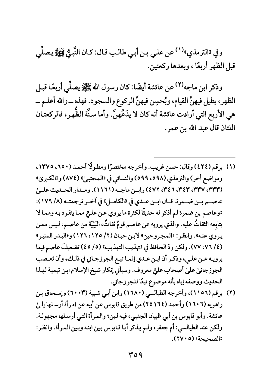 (¬١) برقم (٤٢٤) وقال: حسن غريب. وأخرجه مختصرًا ومطولًا أحمد (٦٥٠، ١٣٧٥، ومواضع أخر) والترمذي (٥٩٨، ٥٩٩) والنسائي في «المجتبى» (٨٧٤) و «الكبرى» (٣٣٣، ٣٣٧، ٣٤٣، ٣٤٦، ٤٧٢) وابن ماجه (١١٦١). ومدار الحديث على عاصم بن ضمرة. قال ابن عدي في «الكامل» في آخر ترجمته (٨/ ١٧٩): «وعاصم بن ضمرة لم أذكر له حديثًا لكثرة ما يروي عن عليٍّ مما ينفرد به ومما لا يتابِعه الثقاتُ عليه. والذي يرويه عن عاصم قومٌ ثقاتٌ، البَلِيّة من عاصم، ليس ممن يروي عنه». وانظر: «المجروحين» لابن حبان (٢/ ١٢٥، ١٢٦) و «البدر المنير» (٤/ ٧٦، ٧٧). ولكن ردّ الحافظ في «تهذيب التهذيب» (٥/ ٤٥) تضعيفَ عاصم فيما يرويه عن علي، وذكر أن ابن عدي إنما تبع الجوزجاني في ذلك، وأن تعصب الجوزجانى على أصحاب عليٍّ معروف. وسيأتي إنكار شيخ الإسلام ابن تيمية لهذا الحديث ووصفه إياه بأنه موضوع تبعًا للجوزجاني.