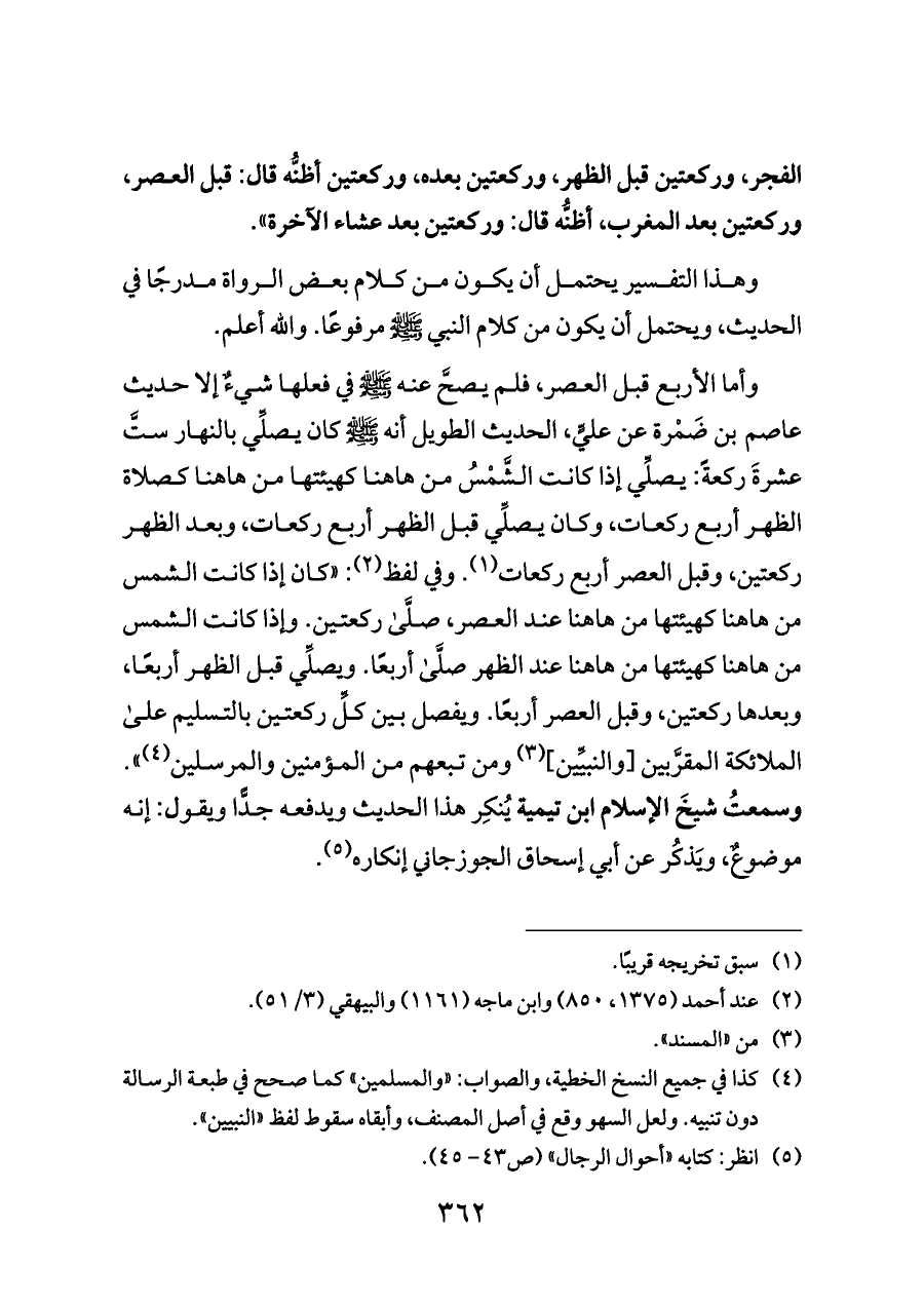 وأما الأربع قبل العصر، فلم يصحَّ عنه - صلى الله عليه وسلم - في فعلها شيءٌ إلا حديث عاصم بن ضَمْرة عن عليٍّ، الحديث الطويل أنه - صلى الله عليه وسلم - كان يصلِّي بالنهار ستَّ عشرةَ ركعةً: يصلِّي إذا كانت الشَّمْسُ من هاهنا كهيئتها من هاهنا كصلاة الظهر أربع ركعات، وكان يصلِّي قبل الظهر أربع ركعات، وبعد الظهر ركعتين، وقبل العصر أربع ركعات (¬٢). وفي لفظ (¬٣): «كان إذا كانت الشمس من هاهنا كهيئتها من هاهنا عند العصر، صلَّى ركعتين. وإذا كانت الشمس من هاهنا كهيئتها من هاهنا عند الظهر صلَّى أربعًا. ويصلِّي قبل الظهر أربعًا، وبعدها ركعتين، وقبل العصر أربعًا. ويفصل بين كلِّ ركعتين بالتسليم على الملائكة المقرَّبين [والنبيِّين] (¬٤) ومن تبعهم من المؤمنين والمرسلين (¬٥)». وسمعتُ شيخَ الإسلام ابن تيمية يُنكِر هذا الحديث ويدفعه جدًّا ويقول: إنه موضوعٌ، ويَذكُر عن أبي إسحاق الجوزجاني إنكاره (¬٦).