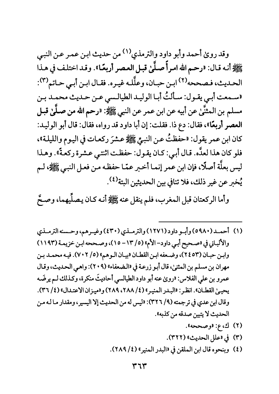 وقد روى أحمد وأبو داود والترمذي (¬١) من حديث ابن عمر عن النبي - صلى الله عليه وسلم - أنه قال: «رحم الله امرأً صلَّى قبل العصر أربعًا». وقد اختلف في هذا الحديث، فصححه (¬٢) ابن حبان، وعلَّله غيره. فقال ابن أبي حاتم (¬٣): «سمعت أبي يقول: سألتُ أبا الوليد الطيالسي عن حديث محمد بن مسلم بن المثنَّى عن أبيه عن ابن عمر عن النبي - صلى الله عليه وسلم -: «رحم الله من صلَّى قبل العصر أربعًا»، فقال: دع ذا. فقلت: إن أبا داود قد رواه، فقال: قال أبو الوليد: كان ابن عمر يقول: «حفظتُ عن النبيِّ - صلى الله عليه وسلم - عشرَ ركعات في اليوم والليلة»، فلو كان هذا لعدَّه. قال أبي: كان يقول: حفظت اثنتي عشرة ركعةً». وهذا ليس بعلَّة أصلًا، فإن ابن عمر إنما أخبر عمّا حفظه من فعل النبي - صلى الله عليه وسلم -، لم يُخبر عن غير ذلك، فلا تنافي بين الحديثين البتة (¬٤).