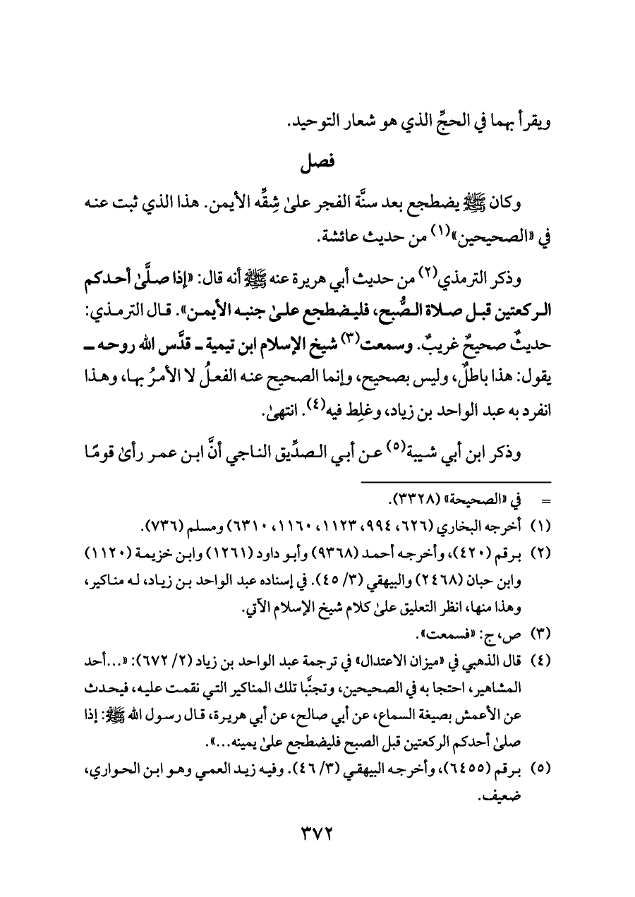 (¬٥) قال الذهبي في «ميزان الاعتدال» في ترجمة عبد الواحد بن زياد (٢/ ٦٧٢): « ... أحد المشاهير، احتجا به في الصحيحين، وتجنَّبا تلك المناكير التي نقمت عليه، فيحدث عن الأعمش بصيغة السماع، عن أبي صالح، عن أبي هريرة، قال رسول الله - صلى الله عليه وسلم -: إذا صلى أحدكم الركعتين قبل الصبح فليضطجع على يمينه ... ».