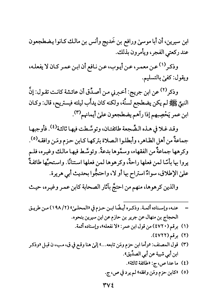 وذكر (¬٢) عن ابن جريج: أخبرني من أصدِّق أن عائشة كانت تقول: إنَّ النبيَّ - صلى الله عليه وسلم - لم يكن يضطجع لسنَّة، ولكنه كان يدأَب ليلته فيستريح، قال: وكان ابن عمر يَحْصِبهم إذا رآهم يضطجعون على أيمانهم (¬٣).