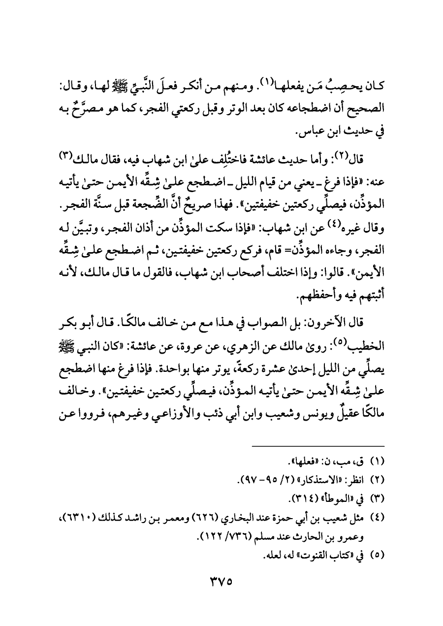 كان يحصِبُ مَن يفعلها (¬١). ومنهم من أنكر فعلَ النَّبيِّ - صلى الله عليه وسلم - لها، وقال: الصحيح أن اضطجاعه كان بعد الوتر وقبل ركعتي الفجر، كما هو مصرَّحٌ به في حديث ابن عباس.