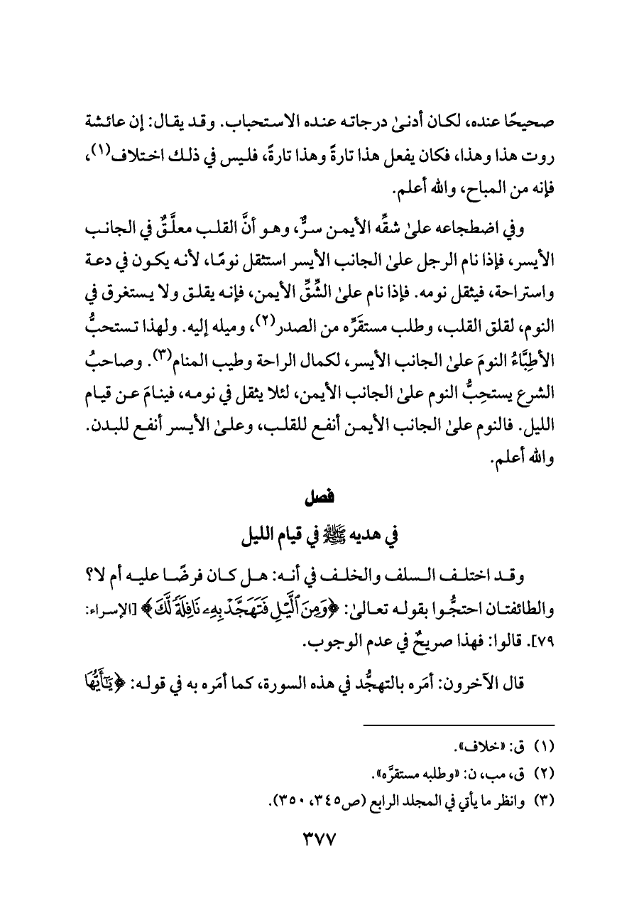 وفي اضطجاعه على شقِّه الأيمن سرٌّ، وهو أنَّ القلب معلَّقٌ في الجانب الأيسر، فإذا نام الرجل على الجانب الأيسر استثقل نومًا، لأنه يكون في دعة واستراحة، فيثقل نومه. فإذا نام على الشِّقِّ الأيمن، فإنه يقلق ولا يستغرق في النوم، لقلق القلب، وطلب مستقَرِّه من الصدر (¬٢)، وميله إليه. ولهذا تستحبُّ الأطِبَّاءُ النومَ على الجانب الأيسر، لكمال الراحة وطيب المنام (¬٣). وصاحبُ الشرع يستحِبُّ النوم على الجانب الأيمن، لئلا يثقل في نومه، فينامَ عن قيام الليل. فالنوم على الجانب الأيمن أنفع للقلب، وعلى الأيسر أنفع للبدن. والله أعلم.