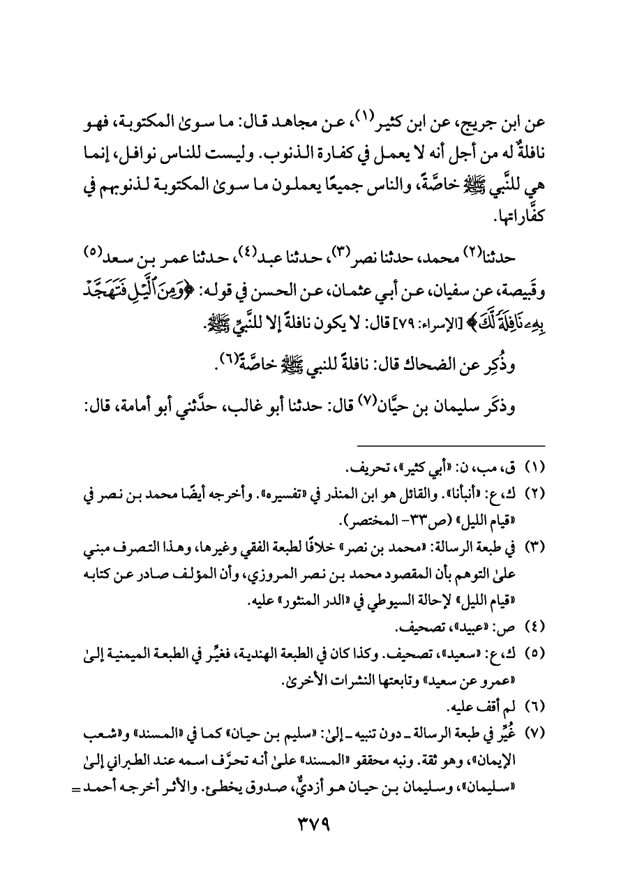 (¬٣) في طبعة الرسالة: «محمد بن نصر» خلافًا لطبعة الفقي وغيرها، وهذا التصرف مبني على التوهم بأن المقصود محمد بن نصر المروزي، وأن المؤلف صادر عن كتابه «قيام الليل» لإحالة السيوطي في «الدر المنثور» عليه.