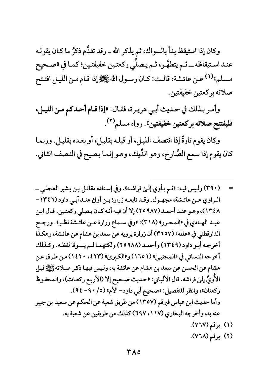 وكان إذا استيقظ بدأ بالسواك، ثم يذكر الله ــ وقد تقدَّم ذكرُ ما كان يقوله عند استيقاظه ــ ثم يتطهَّر، ثم يصلِّي ركعتين خفيفتين؛ كما في «صحيح مسلم» (¬١) عن عائشة، قالت: كان رسول الله - صلى الله عليه وسلم - إذا قام من الليل افتتح صلاته بركعتين خفيفتين.
