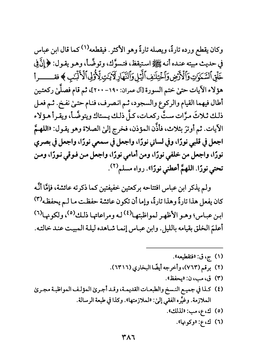 وكان يقطع ورده تارةً، ويصله تارةً وهو الأكثر. فيقطعه (¬١) كما قال ابن عباس في حديث مبيته عنده أنه - صلى الله عليه وسلم - استيقظ، فتسوَّك، وتوضَّأ، وهو يقول: {إِنَّ فِي خَلْقِ السَّمَاوَاتِ وَالْأَرْضِ وَاخْتِلَافِ اللَّيْلِ وَالنَّهَارِ لَآيَاتٍ لِأُولِي الْأَلْبَابِ} فقرأ هؤلاء الآيات حتى ختم السورة [آل عمران: ١٩٠ - ٢٠٠]، ثم قام فصلَّى ركعتين أطال فيهما القيام والركوع والسجود، ثم انصرف، فنام حتى نفخ. ثم فعل ذلك ثلاثَ مرَّات ستَّ ركعات، كلَّ ذلك يستاك ويتوضَّأ، ويقرأ هؤلاء الآيات. ثم أوترَ بثلاث، فأذَّن المؤذن، فخرج إلى الصلاة وهو يقول: «اللهمَّ اجعل في قلبي نورًا، وفي لساني نورًا، واجعل في سمعي نورًا، واجعل في بصري نورًا، واجعل من خلفي نورًا، ومن أمامي نورًا، واجعل من فوقي نورًا، ومن تحتي نورًا. اللهمَّ أعطني نورًا». رواه مسلم (¬٢).
