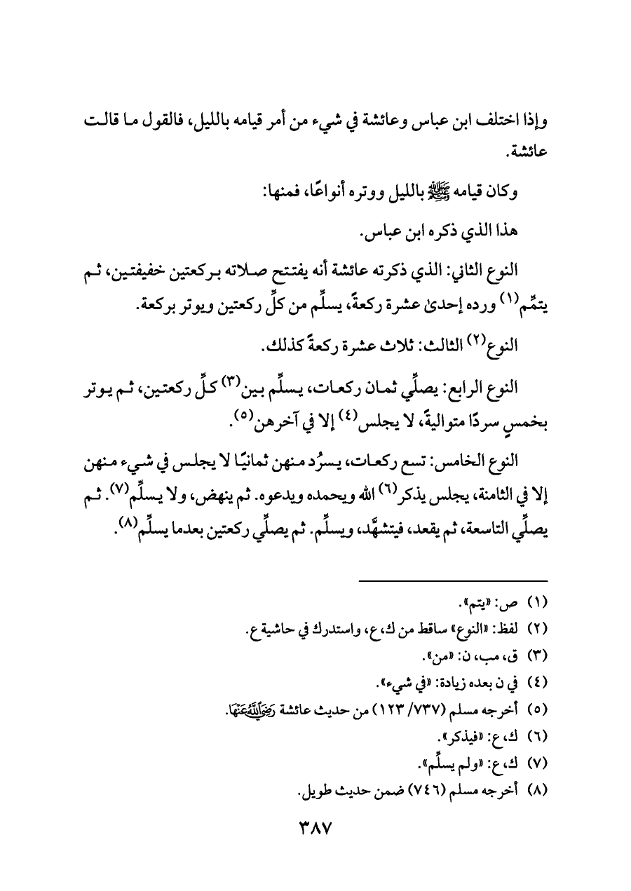 النوع الخامس: تسع ركعات، يسرُد منهن ثمانيًا لا يجلس في شيء منهن إلا في الثامنة، يجلس يذكر (¬٦) الله ويحمده ويدعوه. ثم ينهض، ولا يسلِّم (¬٧). ثم يصلِّي التاسعة، ثم يقعد، فيتشهَّد، ويسلِّم. ثم يصلِّي ركعتين بعدما يسلِّم (¬٨).