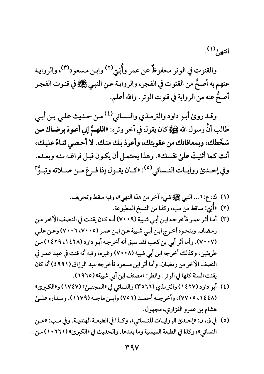 (¬٣) أما أثر عمر فأخرجه ابن أبي شيبة (٧٠٠٩) أنه كان يقنت في النصف الآخر من رمضان. وبنحوه أخرج ابن أبي شيبة عن ابن عمر (٧٠٠٥، ٧٠٠٦) وعن علي (٧٠٠٧). وأما أثر أبي بن كعب فقد سبق أنه أخرجه أبو داود (١٤٢٨، ١٤٢٩) من طريقين، وكذلك أخرجه ابن أبي شيبة (٧٠٠٨) وغيره، وفيه أنه قنت في عهد عمر في النصف الآخر من رمضان. وأما أثر ابن مسعود فأخرجه عبد الرزاق (٤٩٩١) أنه كان يقنت السنة كلها في الوتر. وانظر: «مصنف ابن أبي شيبة» (٦٩٦٥).