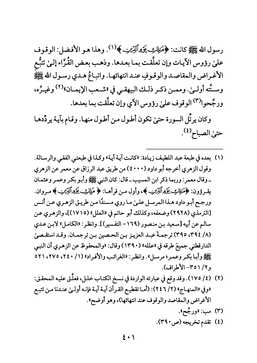 وهذا هو الأفضل: الوقوف على رؤوس الآيات وإن تعلَّقت بما بعدها. وذهب بعض القُرَّاء إلى تتبُّعِ الأغراض والمقاصد والوقوفِ عند انتهائها. واتباعُ هدي رسول الله - صلى الله عليه وسلم - وسنَّته أولى. وممن ذكر ذلك البيهقي في «شعب الإيمان» (¬٢) وغيرُه، ورجَّحوا (¬٣) الوقوف على رؤوس الآي وإن تعلَّقت بما بعدها.
