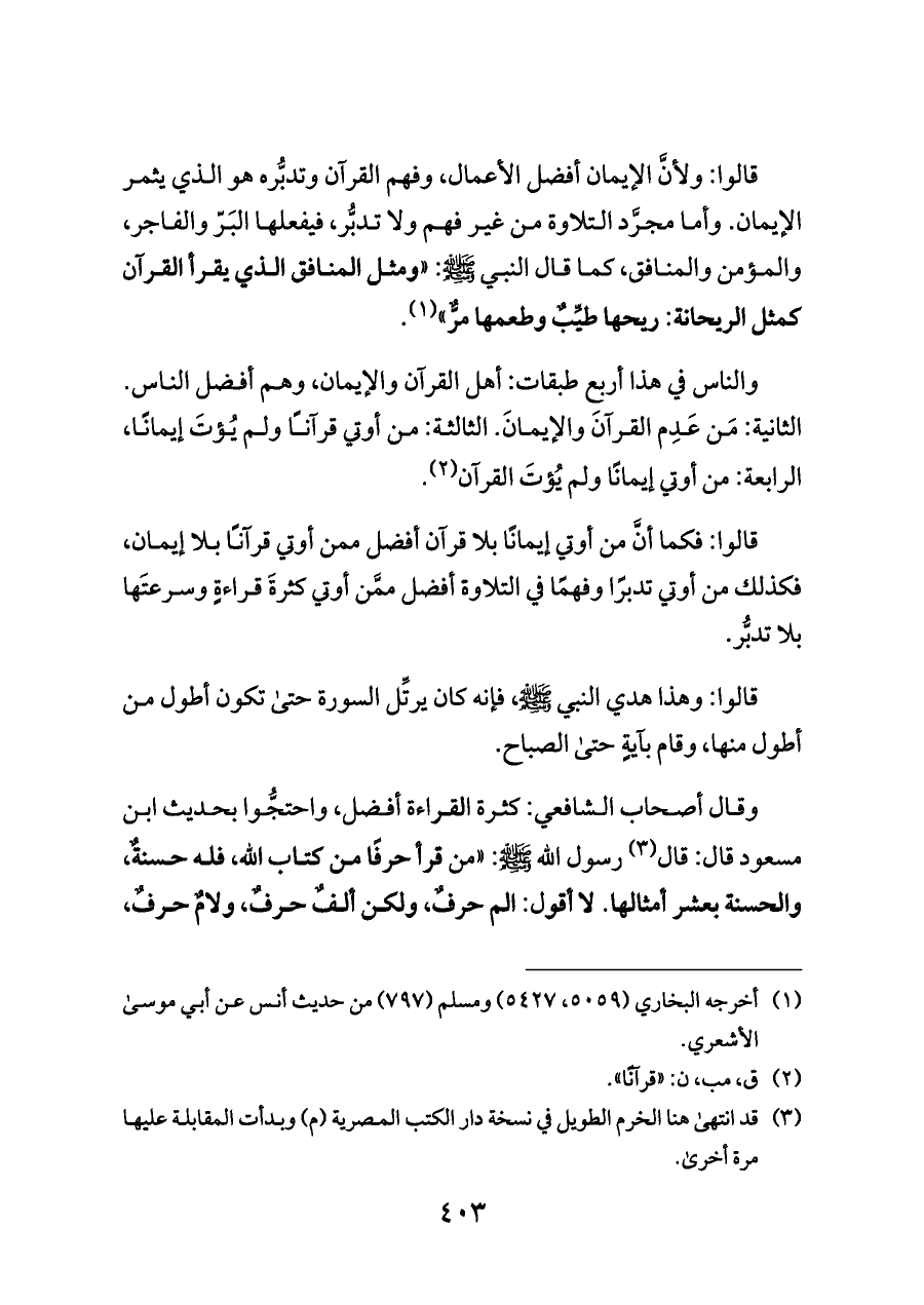 قالوا: ولأنَّ الإيمان أفضل الأعمال، وفهم القرآن وتدبُّره هو الذي يثمر الإيمان. وأما مجرَّد التلاوة من غير فهم ولا تدبُّر، فيفعلها البَرّ والفاجر، والمؤمن والمنافق، كما قال النبي - صلى الله عليه وسلم -: «ومثل المنافق الذي يقرأ القرآن كمثل الريحانة: ريحها طيِّبٌ وطعمها مرٌّ» (¬١).