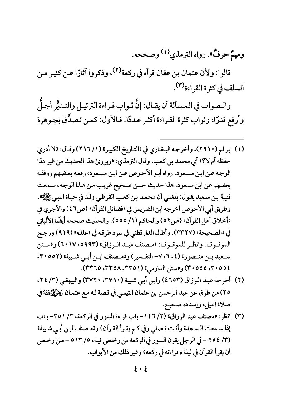 قالوا: ولأن عثمان بن عفان قرأه في ركعة (¬٢)، وذكروا آثارًا عن كثير من السلف في كثرة القراءة (¬٣).