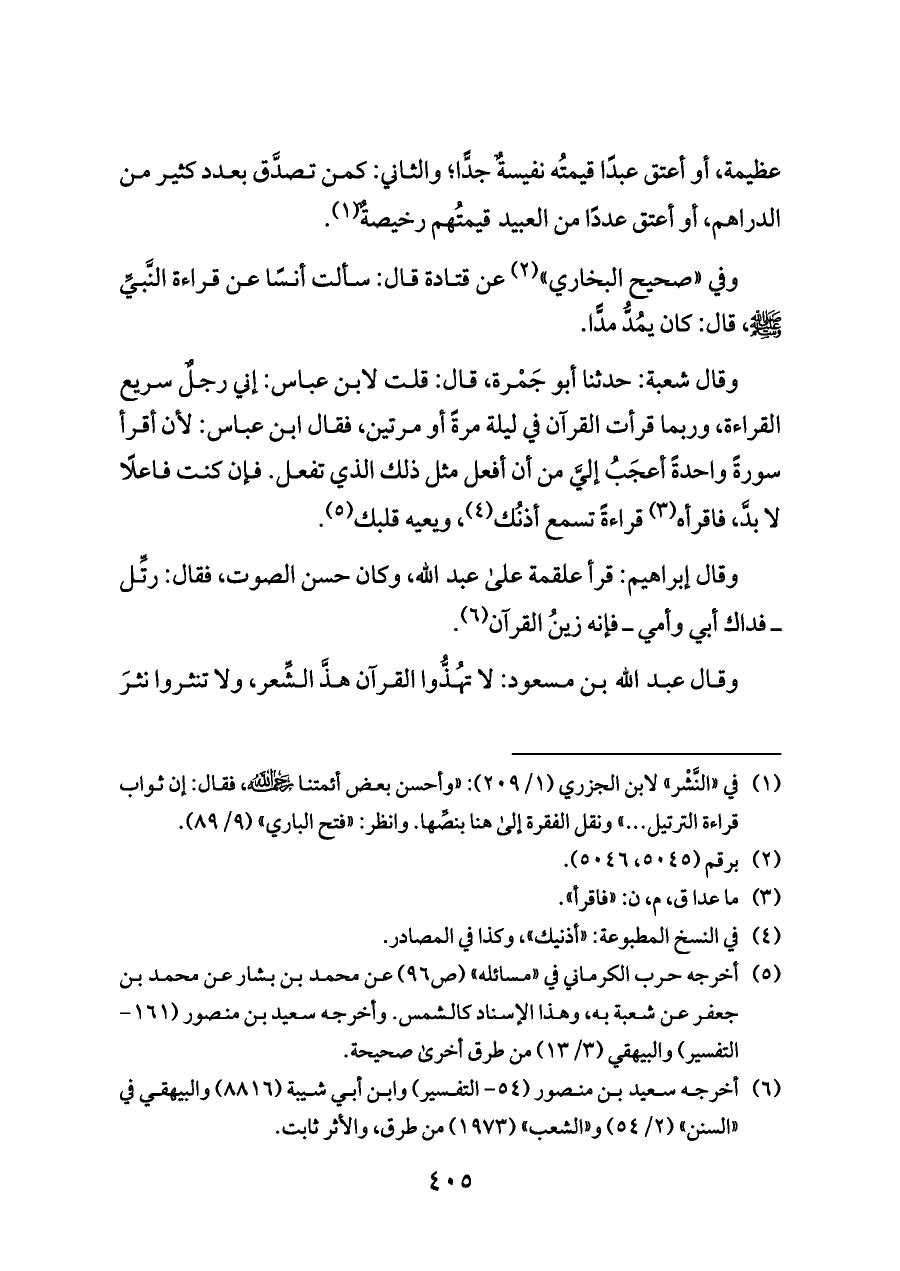 (¬١) في «النَّشْر» لابن الجزري (١/ ٢٠٩): «وأحسن بعض أئمتنا - رحمه الله -، فقال: إن ثواب قراءة الترتيل ... » ونقل الفقرة إلى هنا بنصِّها. وانظر: «فتح الباري» (٩/ ٨٩).