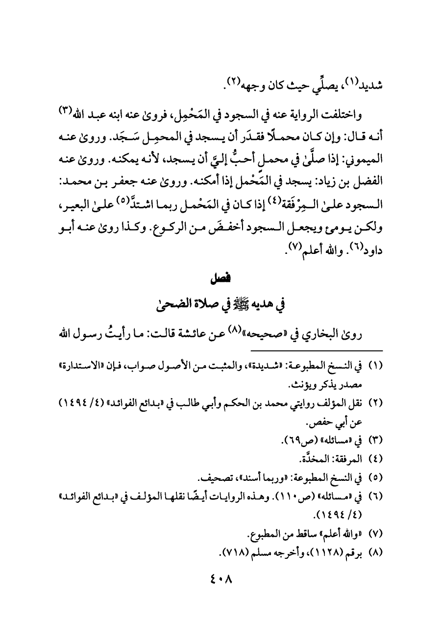 واختلفت الرواية عنه في السجود في المَحْمِل، فروى عنه ابنه عبد الله (¬٣) أنه قال: وإن كان محملًا فقدَر أن يسجد في المحمِل سَجَد. وروى عنه الميموني: إذا صلَّى في محملٍ أحبُّ إليَّ أن يسجد، لأنه يمكنه. وروى عنه الفضل بن زياد: يسجد في المَحْمل إذا أمكنه. وروى عنه جعفر بن محمد: السجود على المِرْفَقة (¬٤) إذا كان في المَحْمل ربما اشتدَّ (¬٥) على البعير، ولكن يومئ ويجعل السجود أخفضَ من الركوع. وكذا روى عنه أبو داود (¬٦). والله أعلم (¬٧).