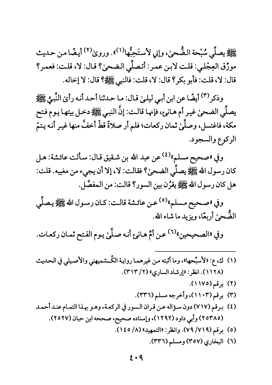 - صلى الله عليه وسلم - يصلِّي سُبْحة الضُّحى، وإني لأستَحِبُّها (¬١)». وروى (¬٢) أيضًا من حديث مورِّق العِجْلي: قلت لابن عمر: أتصلِّي الضحى؟ قال: لا، قلت: فعمر؟ قال: لا، قلت: فأبو بكر؟ قال: لا، قلت: فالنبي - صلى الله عليه وسلم -؟ قال: لا إخاله.