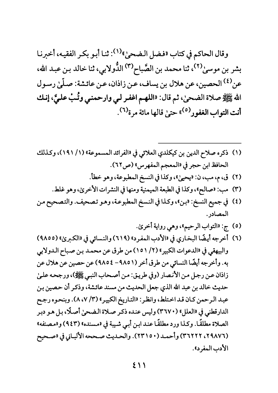 وقال الحاكم في كتاب «فضل الضحى» (¬٦): ثنا أبو بكر الفقيه، أخبرنا بشر بن موسى (¬٧)، ثنا محمد بن الصَّباح (¬٨) الدُّولابي، ثنا خالد بن عبد الله، عن (¬٩) الحصين، عن هلال بن يساف، عن زاذان، عن عائشة: صلّى رسول الله - صلى الله عليه وسلم - صلاة الضحى، ثم قال: «اللهم اغفر لي وارحمني وتُبْ عليَّ، إنك أنت التواب الغفور (¬١٠)» حتى قالها مائة مرة (¬١١).