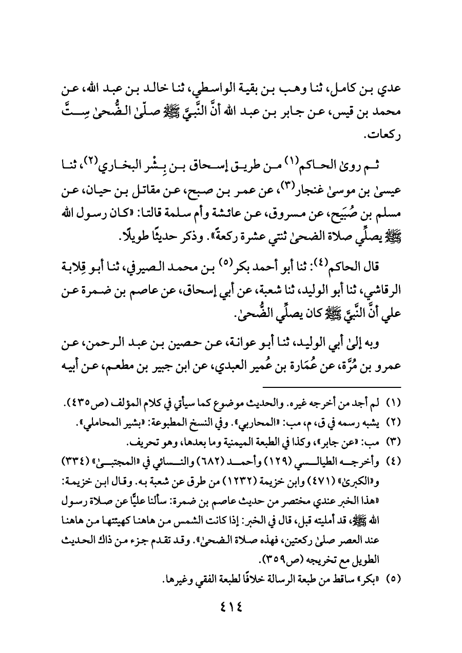 عدي بن كامل، ثنا وهب بن بقية الواسطي، ثنا خالد بن عبد الله، عن محمد بن قيس، عن جابر بن عبد الله أنَّ النَّبيَّ - صلى الله عليه وسلم - صلّى الضُّحى سِتَّ ركعات.