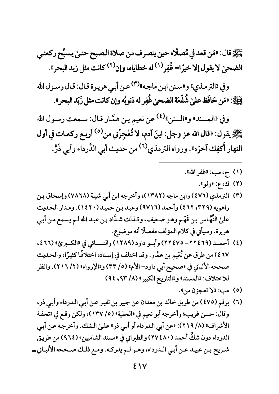 وفي «الترمذي» و «سنن ابن ماجه» (¬٣) عن أبي هريرة قال: قال رسول الله - صلى الله عليه وسلم -: «مَن حَافَظ على شُفْعَة الضحى غُفِر له ذنوبُه وإن كانت مثل زَبَد البحر».