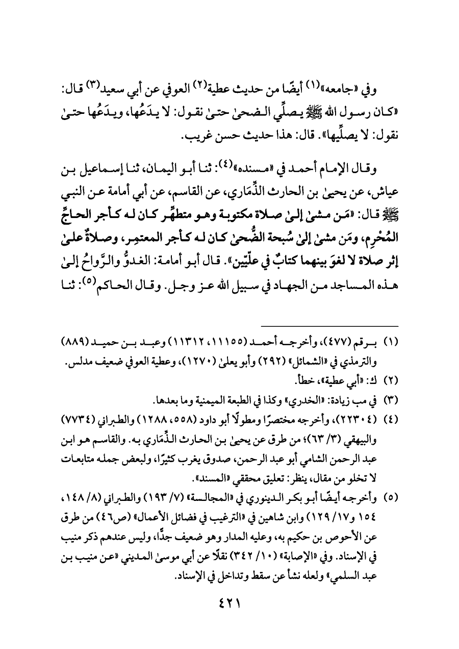 وقال الإمام أحمد في «مسنده» (¬٤): ثنا أبو اليمان، ثنا إسماعيل بن عياش، عن يحيى بن الحارث الذِّمَاري، عن القاسم، عن أبي أمامة عن النبي - صلى الله عليه وسلم - قال: «مَن مشى إلى صلاة مكتوبة وهو متطهِّر كان له كأجر الحاجِّ المُحْرِم، ومَن مشى إلى سُبحة الضُّحى كان له كأجر المعتمِر، وصلاةٌ على إثر صلاة لا لغوَ بينهما كتابٌ في علّيّين». قال أبو أمامة: الغدوُّ والرَّواحُ إلى هذه المساجد من الجهاد في سبيل الله عز وجل. وقال الحاكم (¬٥): ثنا
