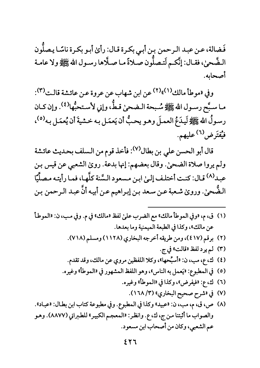 وفي «موطأ مالك (¬١)» (¬٢) عن ابن شهاب عن عروة عن عائشة قالت (¬٣): ما سبَّح رسول الله - صلى الله عليه وسلم - سُبحة الضحى قطُّ، وإني لأستحبُّها (¬٤). وإن كان رسولُ الله - صلى الله عليه وسلم - لَيدَعُ العملَ وهو يحبُّ أن يَعمَل به خشيةَ أن يُعمَل به (¬٥)، فيُفتَرض (¬٦) عليهم.