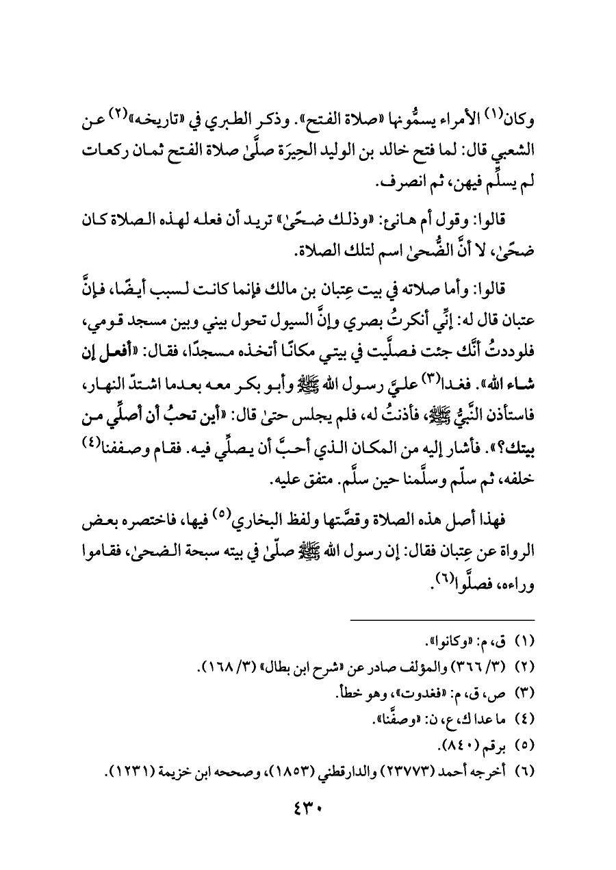 وكان (¬١) الأمراء يسمُّونها «صلاة الفتح». وذكر الطبري في «تاريخه» (¬٢) عن الشعبي قال: لما فتح خالد بن الوليد الحِيرَة صلَّى صلاة الفتح ثمان ركعات لم يسلِّم فيهن، ثم انصرف.