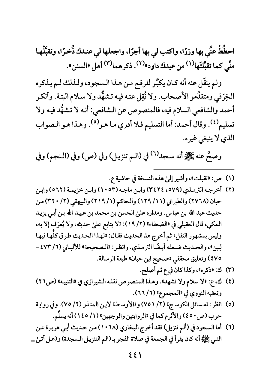 ولم ينقَل عنه أنه كان يكبِّر للرفع من هذا السجود، ولذلك لم يذكره الخِرَقي ومتقدِّمو الأصحاب. ولا نُقِل عنه فيه تشهُّد ولا سلام البتة. وأنكر أحمد والشافعي السلام فيه، فالمنصوص عن الشافعي: أنه لا تشهُّد فيه ولا تسليم (¬٤). وقال أحمد: أما التسليم فلا أدري ما هو (¬٥). وهذا هو الصواب الذي لا ينبغي غيره.