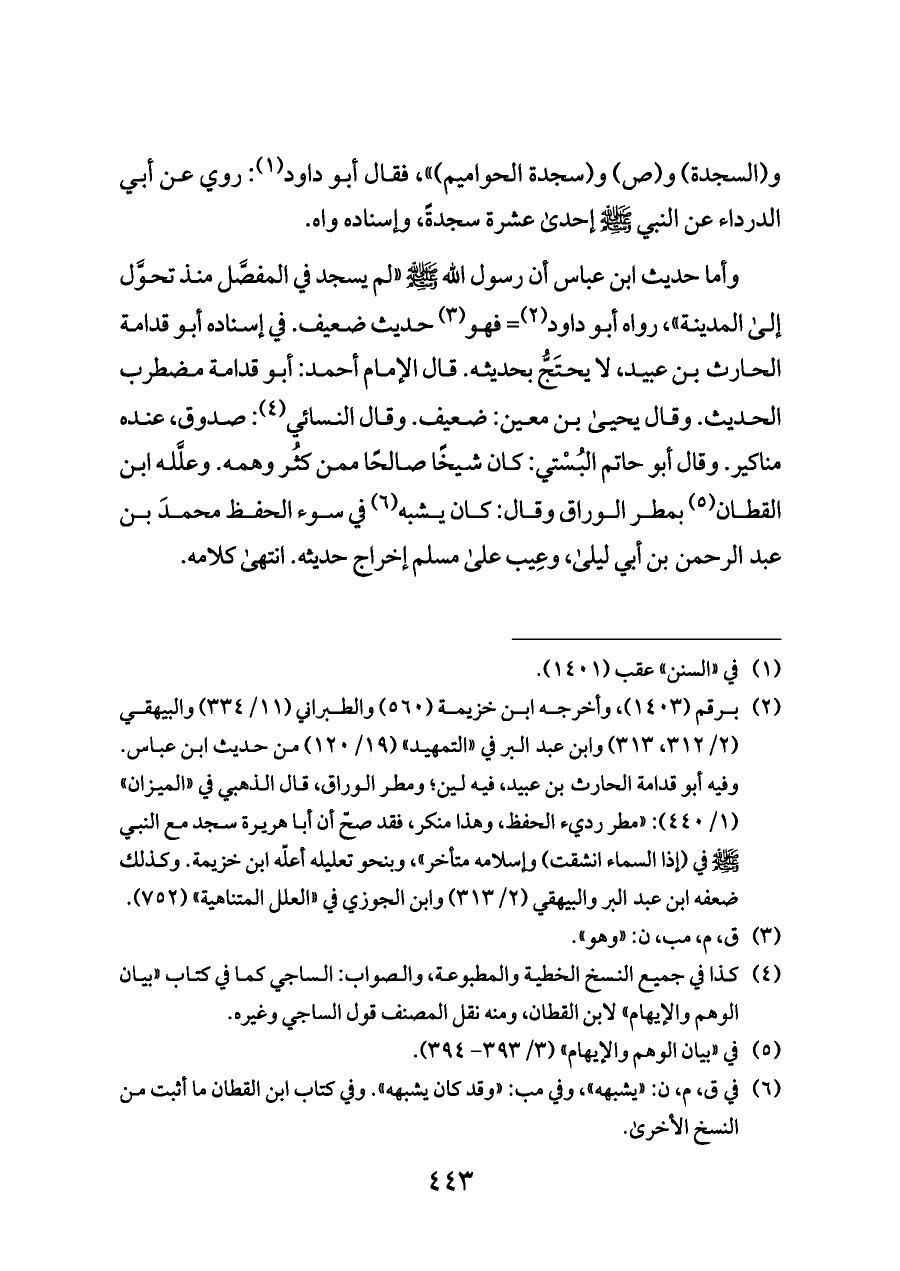 وأما حديث ابن عباس أن رسول الله - صلى الله عليه وسلم - «لم يسجد في المفصَّل منذ تحوَّل إلى المدينة»، رواه أبو داود (¬٢) = فهو (¬٣) حديث ضعيف. في إسناده أبو قدامة الحارث بن عبيد، لا يحتَجُّ بحديثه. قال الإمام أحمد: أبو قدامة مضطرب الحديث. وقال يحيى بن معين: ضعيف. وقال النسائي (¬٤): صدوق، عنده مناكير. وقال أبو حاتم البُسْتي: كان شيخًا صالحًا ممن كثُر وهمه. وعلَّله ابن القطان (¬٥) بمطر الوراق وقال: كان يشبه (¬٦) في سوء الحفظ محمدَ بن عبد الرحمن بن أبي ليلى، وعِيب على مسلم إخراج حديثه. انتهى كلامه.