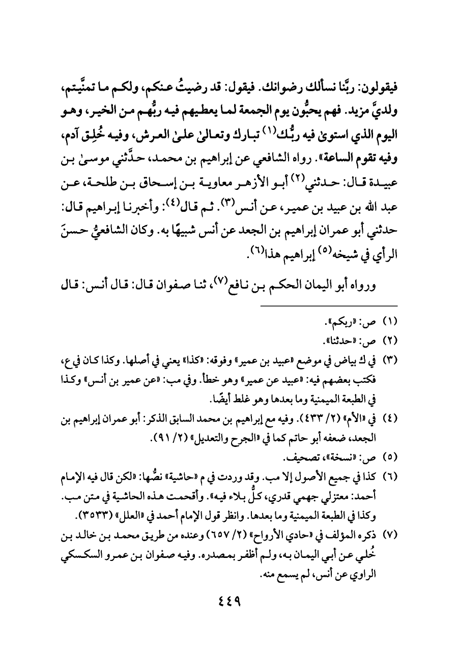 فيقولون: ربَّنا نسألك رضوانك. فيقول: قد رضيتُ عنكم، ولكم ما تمنَّيتم، ولديَّ مزيد. فهم يحبُّون يوم الجمعة لما يعطيهم فيه ربُّهم من الخير، وهو اليوم الذي استوى فيه ربُّك (¬١) تبارك وتعالى على العرش، وفيه خُلِق آدم، وفيه تقوم الساعة». رواه الشافعي عن إبراهيم بن محمد، حدَّثني موسى بن عبيدة قال: حدثني (¬٢) أبو الأزهر معاوية بن إسحاق بن طلحة، عن عبد الله بن عبيد بن عمير، عن أنس (¬٣).