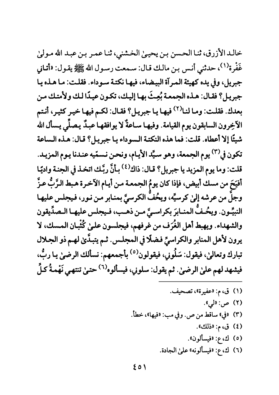 خالد الأزرق، ثنا الحسن بن يحيى الخشني، ثنا عمر بن عبد الله مولى غَفْرة (¬١)، حدثني أنس بن مالك قال: سمعت رسول الله - صلى الله عليه وسلم - يقول: «أتاني جبريل، وفي يده كهيئة المرآة البيضاء، فيها نكتة سوداء. فقلت: ما هذه يا جبريل؟ فقال: هذه الجمعة بُعِثَ بها إليك، تكون عيدًا لك ولأمتك من بعدك. فقلت: وما لنا (¬٢) فيها يا جبريل؟ فقال: لكم فيها خير كثير، أنتم الآخِرون السابقون يوم القيامة. وفيها ساعةٌ لا يوافقها عبدٌ يصلِّي يسأل الله شيئًا إلا أعطاه. قلت: فما هذه النكتة السوداء يا جبريل؟ قال: هذه الساعة تكون في (¬٣) يوم الجمعة، وهو سيِّد الأيام، ونحن نسمّيه عندنا يوم المزيد. قلت: وما يوم المزيد يا جبريل؟ قال: ذاك (¬٤) بأنَّ ربَّك اتخذ في الجنة واديًا أفيَحَ من مسك أبيض، فإذا كان يومُ الجمعة من أيام الآخرة هبط الرَّبُّ عزَّ وجلَّ من عرشه إلى كرسيِّه، ويحُفُّ الكرسيَّ بمنابر من نور، فيجلس عليها النبيِّون. ويحُفُّ المنابرَ بكراسيَّ من ذهب، فيجلس عليها الصدِّيقون والشهداء. ويهبط أهل الغُرَف من غرفهم، فيجلسون على كُثْبان المسك، لا يرون لأهل المنابر والكراسيِّ فضلًا في المجلس. ثم يتبدَّى لهم ذو الجلال تبارك وتعالى، فيقول: سَلُوني، فيقولون (¬٥) بأجمعهم: نسألك الرضى يا ربُّ، فيشهد لهم على الرضى. ثم يقول: سلوني، فيسألوه (¬٦) حتى تنتهي نَهْمةُ كلِّ