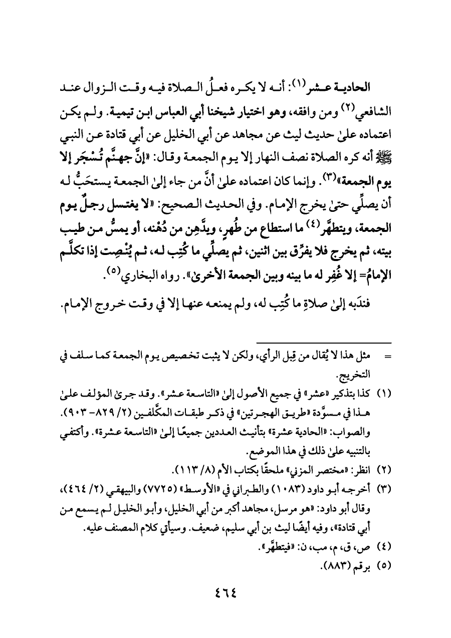 الحادية عشر (¬١): أنه لا يكره فعلُ الصلاة فيه وقت الزوال عند الشافعي (¬٢) ومن وافقه، وهو اختيار شيخنا أبي العباس ابن تيمية. ولم يكن اعتماده على حديث ليث عن مجاهد عن أبي الخليل عن أبي قتادة عن النبي - صلى الله عليه وسلم - أنه كره الصلاة نصف النهار إلا يوم الجمعة وقال: «إنَّ جهنَّم تُسْجَر إلا يوم الجمعة» (¬٣). وإنما كان اعتماده على أنَّ من جاء إلى الجمعة يستحَبُّ له أن يصلِّي حتى يخرج الإمام. وفي الحديث الصحيح: «لا يغتسل رجلٌ يوم الجمعة، ويتطهَّر (¬٤) ما استطاع من طُهرٍ، ويدَّهِن من دُهْنه، أو يمسُّ من طيب بيته، ثم يخرج فلا يفرِّق بين اثنين، ثم يصلِّي ما كُتِب له، ثم يُنْصِت إذا تكلَّم الإمامُ= إلا غُفِر له ما بينه وبين الجمعة الأخرى». رواه البخاري (¬٥).