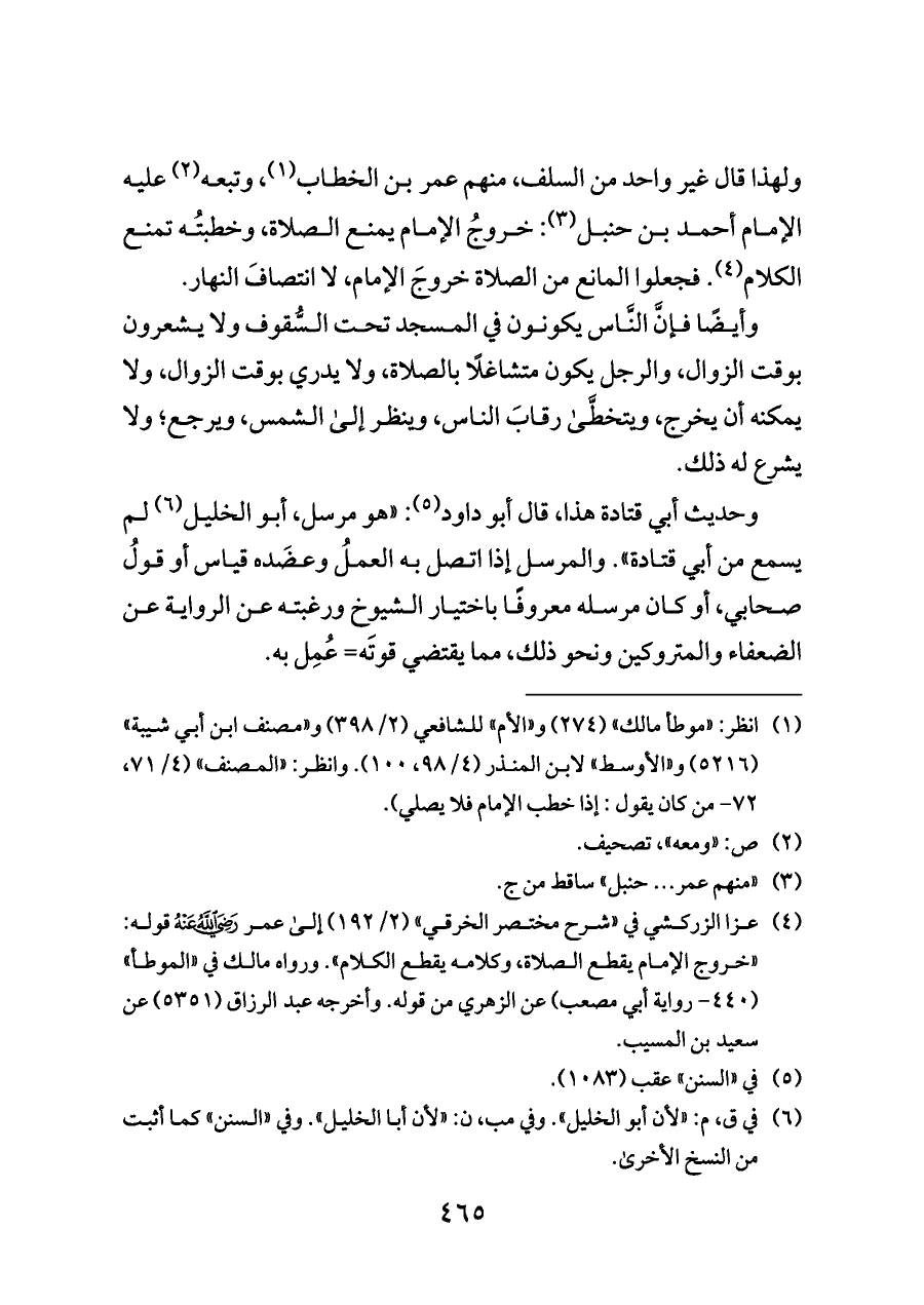 (¬٤) عزا الزركشي في «شرح مختصر الخرقي» (٢/ ١٩٢) إلى عمر - رضي الله عنه - قوله: «خروج الإمام يقطع الصلاة، وكلامه يقطع الكلام». ورواه مالك في «الموطأ» (٤٤٠ - رواية أبي مصعب) عن الزهري من قوله. وأخرجه عبد الرزاق (٥٣٥١) عن سعيد بن المسيب.