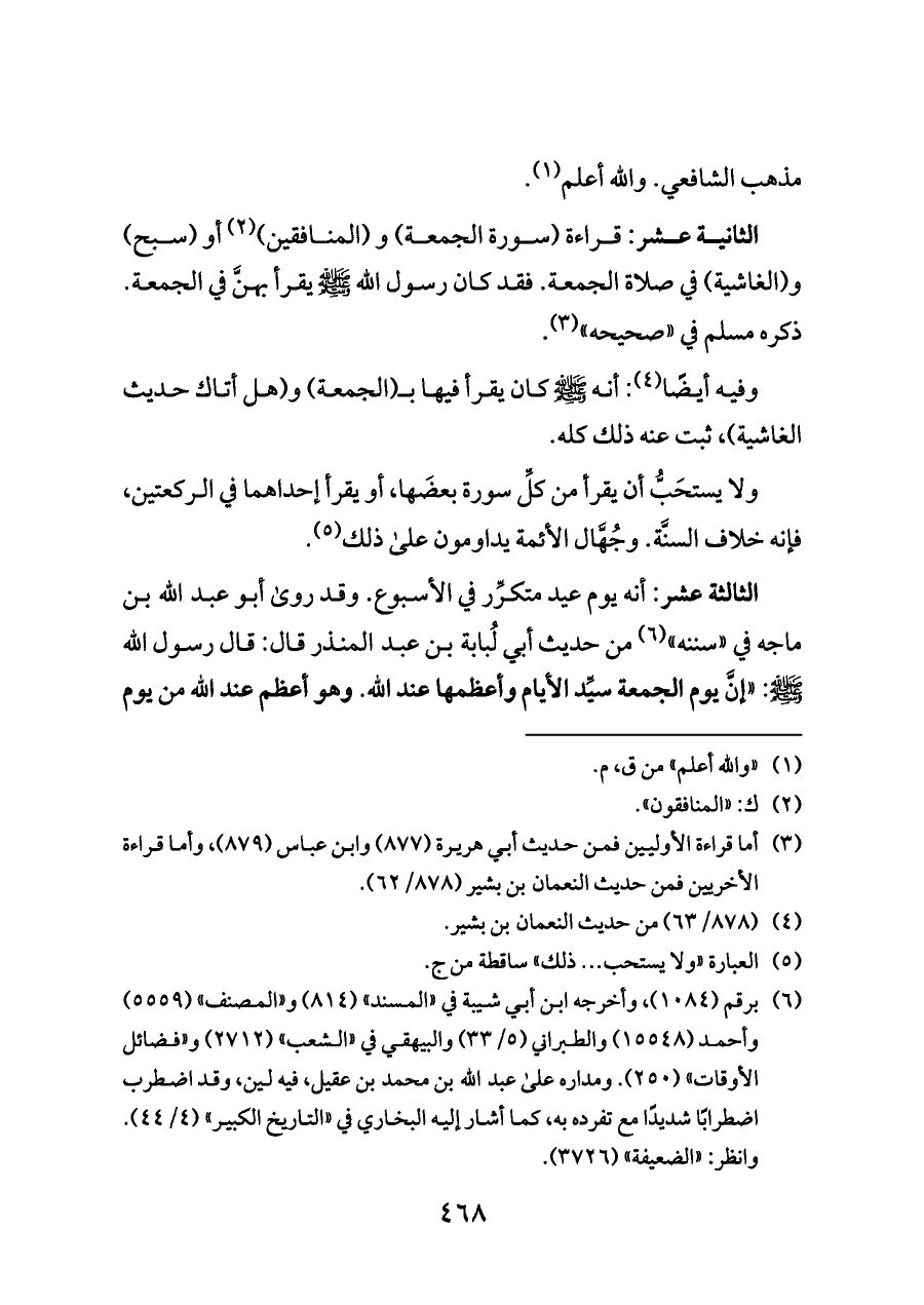 الثانية عشر: قراءة (سورة الجمعة) و (المنافقين) (¬٢) أو (سبح) و (الغاشية) في صلاة الجمعة. فقد كان رسول الله - صلى الله عليه وسلم - يقرأ بهنَّ في الجمعة. ذكره مسلم في «صحيحه» (¬٣).
