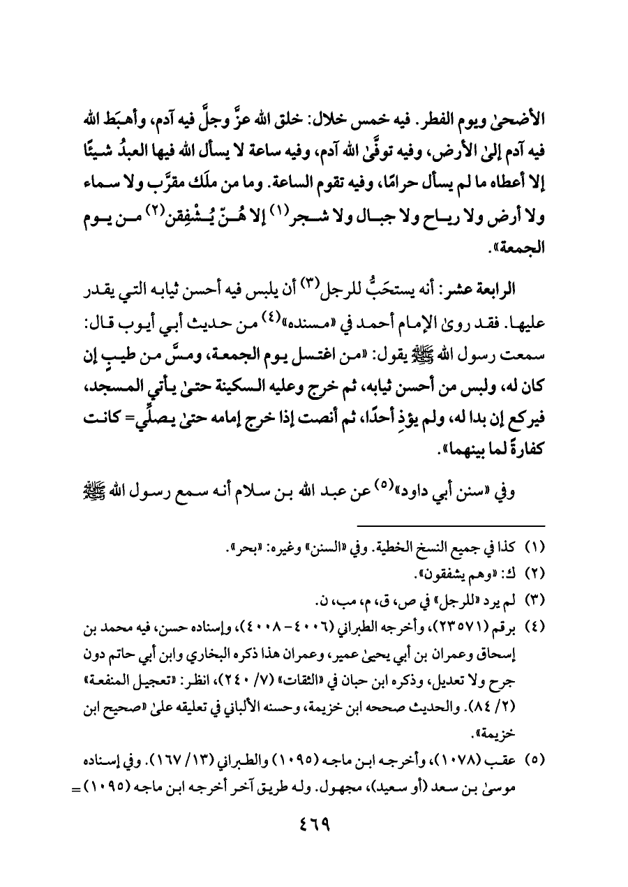 الرابعة عشر: أنه يستحَبُّ للرجل (¬٣) أن يلبس فيه أحسن ثيابه التي يقدر عليها. فقد روى الإمام أحمد في «مسنده» (¬٤) من حديث أبي أيوب قال: سمعت رسول الله - صلى الله عليه وسلم - يقول: «من اغتسل يوم الجمعة، ومسَّ من طيبٍ إن كان له، ولبس من أحسن ثيابه، ثم خرج وعليه السكينة حتى يأتي المسجد، فيركع إن بدا له، ولم يؤذِ أحدًا، ثم أنصت إذا خرج إمامه حتى يصلِّي= كانت كفارةً لما بينهما».