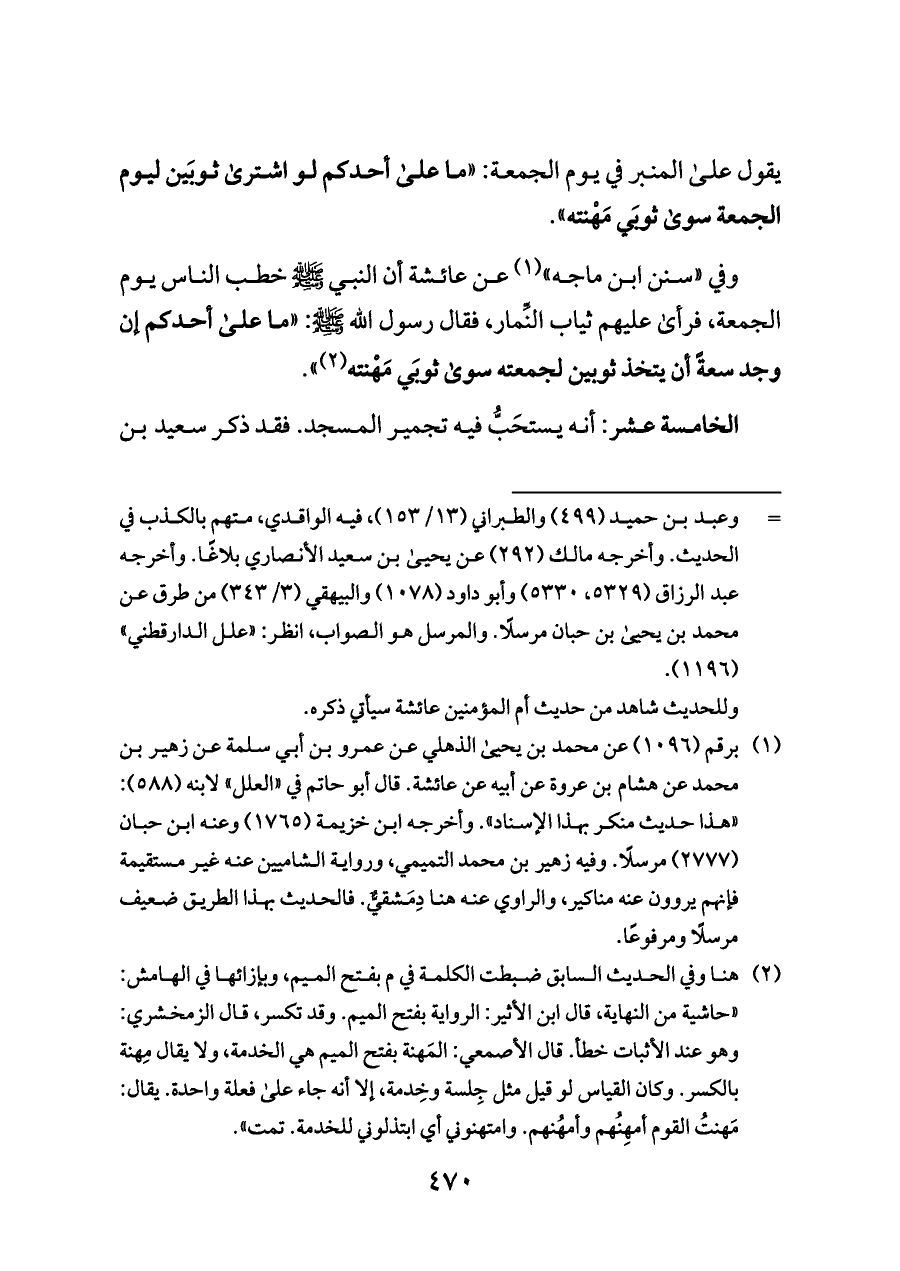 يقول على المنبر في يوم الجمعة: «ما على أحدكم لو اشترى ثوبَين ليوم الجمعة سوى ثوبَي مَهْنته».