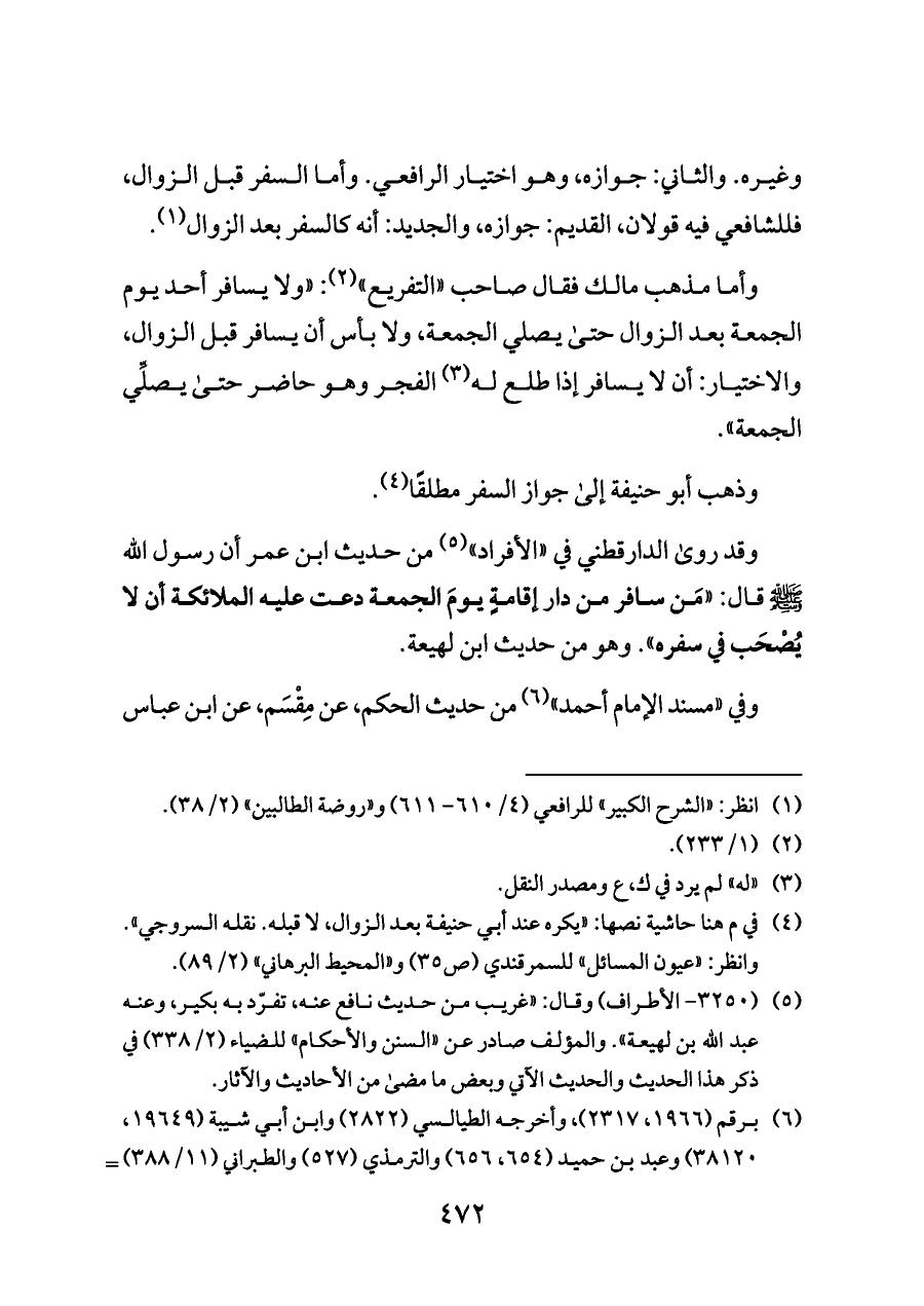 وغيره. والثاني: جوازه، وهو اختيار الرافعي. وأما السفر قبل الزوال، فللشافعي فيه قولان, القديم: جوازه، والجديد: أنه كالسفر بعد الزوال (¬١).
