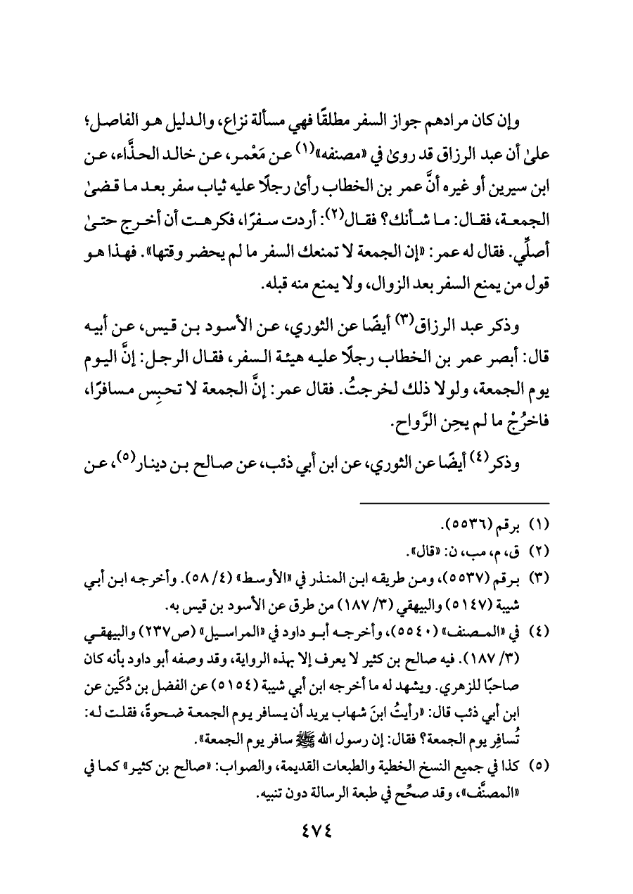 (¬٤) في «المصنف» (٥٥٤٠)، وأخرجه أبو داود في «المراسيل» (ص ٢٣٧) والبيهقي (٣/ ١٨٧). فيه صالح بن كثير لا يعرف إلا بهذه الرواية، وقد وصفه أبو داود بأنه كان صاحبًا للزهري. ويشهد له ما أخرجه ابن أبي شيبة (٥١٥٤) عن الفضل بن دُكَين عن ابن أبي ذئب قال: «رأيتُ ابنَ شهاب يريد أن يسافر يوم الجمعة ضحوةً، فقلت له: تُسافِر يوم الجمعة؟ فقال: إن رسول الله - صلى الله عليه وسلم - سافر يوم الجمعة».