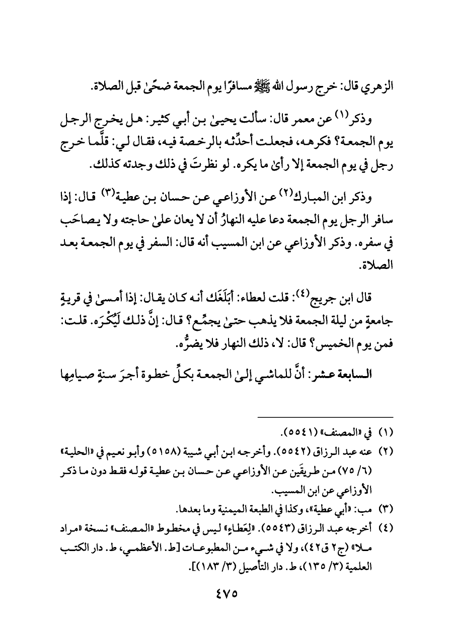 قال ابن جريج (¬٤): قلت لعطاء: أبَلَغَك أنه كان يقال: إذا أمسى في قريةٍ جامعةٍ من ليلة الجمعة فلا يذهب حتى يجمِّع؟ قال: إنَّ ذلك لَيُكْرَه. قلت: فمن يوم الخميس؟ قال: لا, ذلك النهار فلا يضرُّه.