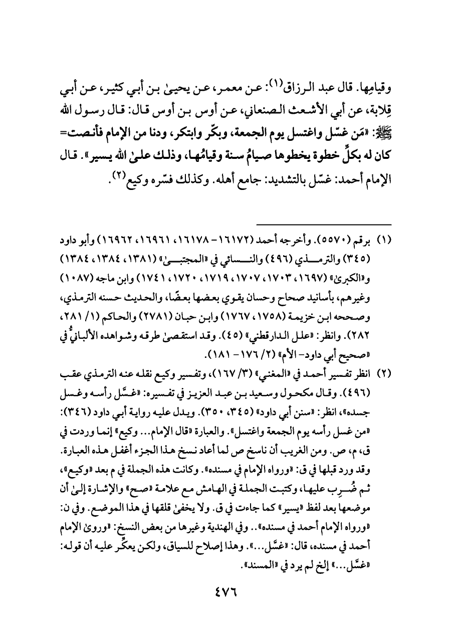 (¬٢) انظر تفسير أحمد في «المغني» (٣/ ١٦٧)، وتفسير وكيع نقله عنه الترمذي عقب (٤٩٦). وقال مكحول وسعيد بن عبد العزيز في تفسيره: «غسَّل رأسه وغسل جسده» , انظر: «سنن أبي داود» (٣٤٥، ٣٥٠). ويدل عليه رواية أبي داود (٣٤٦): «من غسل رأسه يوم الجمعة واغتسل». والعبارة «قال الإمام ... وكيع» إنما وردت في ق، م، ص. ومن الغريب أن ناسخ ص لما أعاد نسخ هذا الجزء أغفل هذه العبارة. وقد ورد قبلها في ق: «ورواه الإمام في مسنده». وكانت هذه الجملة في م بعد «وكيع»، ثم ضُرِب عليها، وكتبت الجملة في الهامش مع علامة «صح» والإشارة إلى أن موضعها بعد لفظ «يسير» كما جاءت في ق. ولا يخفى قلقها في هذا الموضع. وفي ن: «ورواه الإمام أحمد في مسنده» .. وفي الهندية وغيرها من بعض النسخ: «وروى الإمام أحمد في مسنده، قال: «غسَّل ... ». وهذا إصلاح للسياق، ولكن يعكِّر عليه أن قوله: «غسَّل ... ».إلخ لم يرد في «المسند».