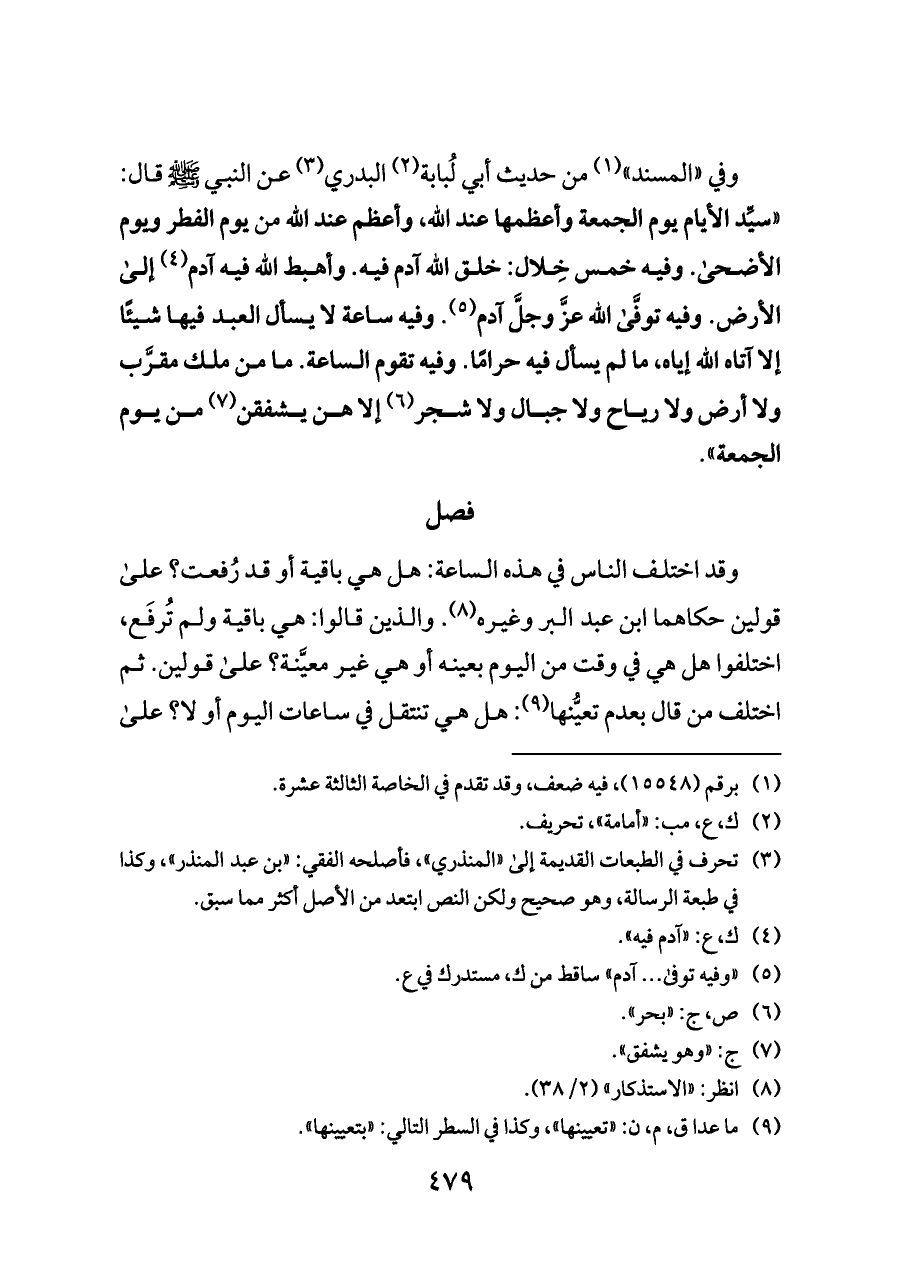 وفي «المسند» (¬١) من حديث أبي لُبابة (¬٢) البدري (¬٣) عن النبي - صلى الله عليه وسلم - قال: «سيِّد الأيام يوم الجمعة وأعظمها عند الله، وأعظم عند الله من يوم الفطر ويوم الأضحى. وفيه خمس خِلال: خلق الله آدم فيه. وأهبط الله فيه آدم (¬٤) إلى الأرض. وفيه توفَّى الله عزَّ وجلَّ آدم (¬٥). وفيه ساعة لا يسأل العبد فيها شيئًا إلا آتاه الله إياه، ما لم يسأل فيه حرامًا. وفيه تقوم الساعة. ما من ملك مقرَّب ولا أرض ولا رياح ولا جبال ولا شجر (¬٦) إلا هن يشفقن (¬٧) من يوم الجمعة».